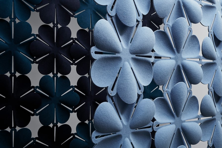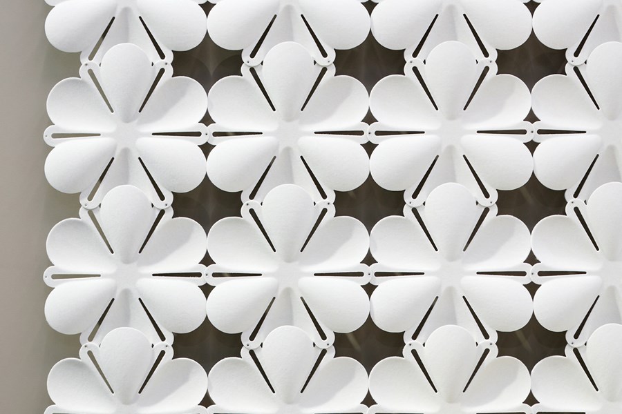 Abstracta’s Airbloom, light and airy, serves to create dynamic spaces and separation in libraries while enhancing acoustics. Inspired by natural flower-like modules, they assemble using small plastic connectors.