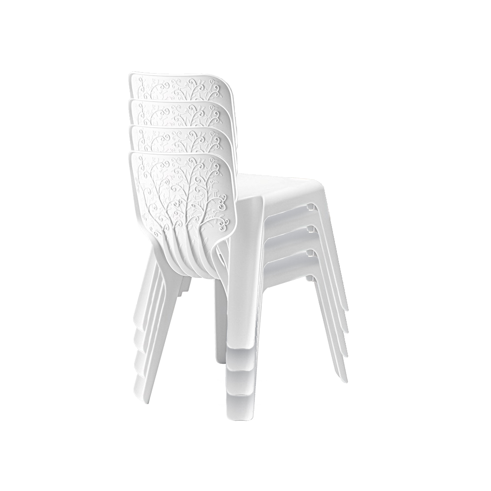 A light, stackable children’s chair with a unique seatback. The back is decorated with branches, leaves and even little birds here and there.