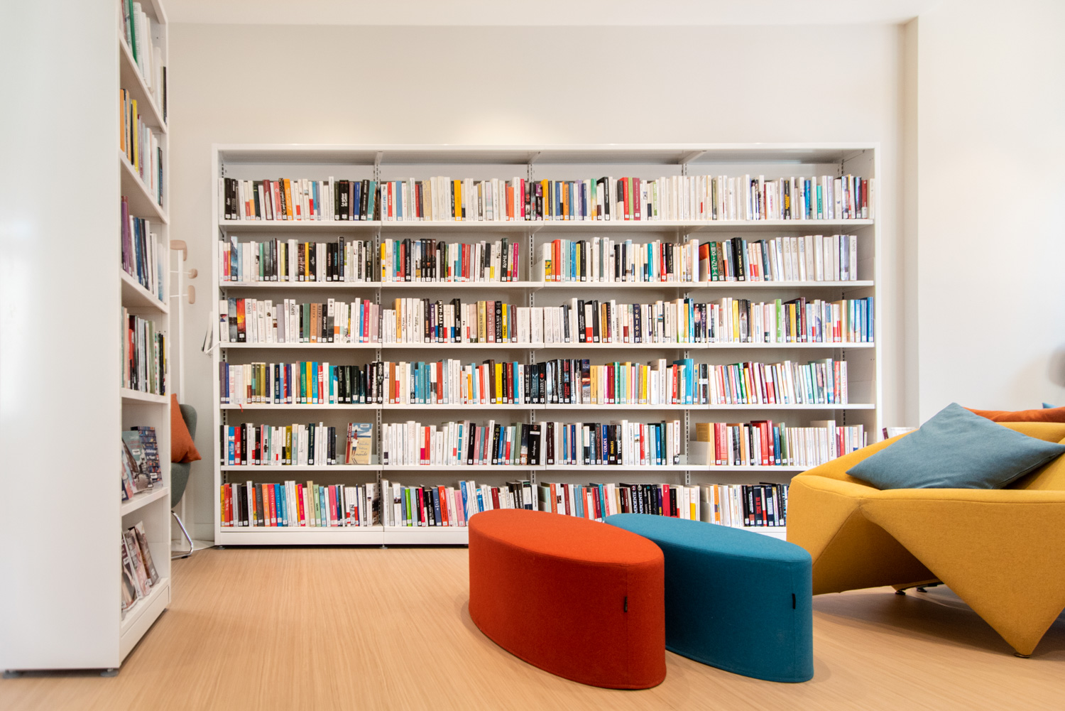 This fresh and multifunctional pouf from Softline is a nice supplement to the more traditional library furniture.