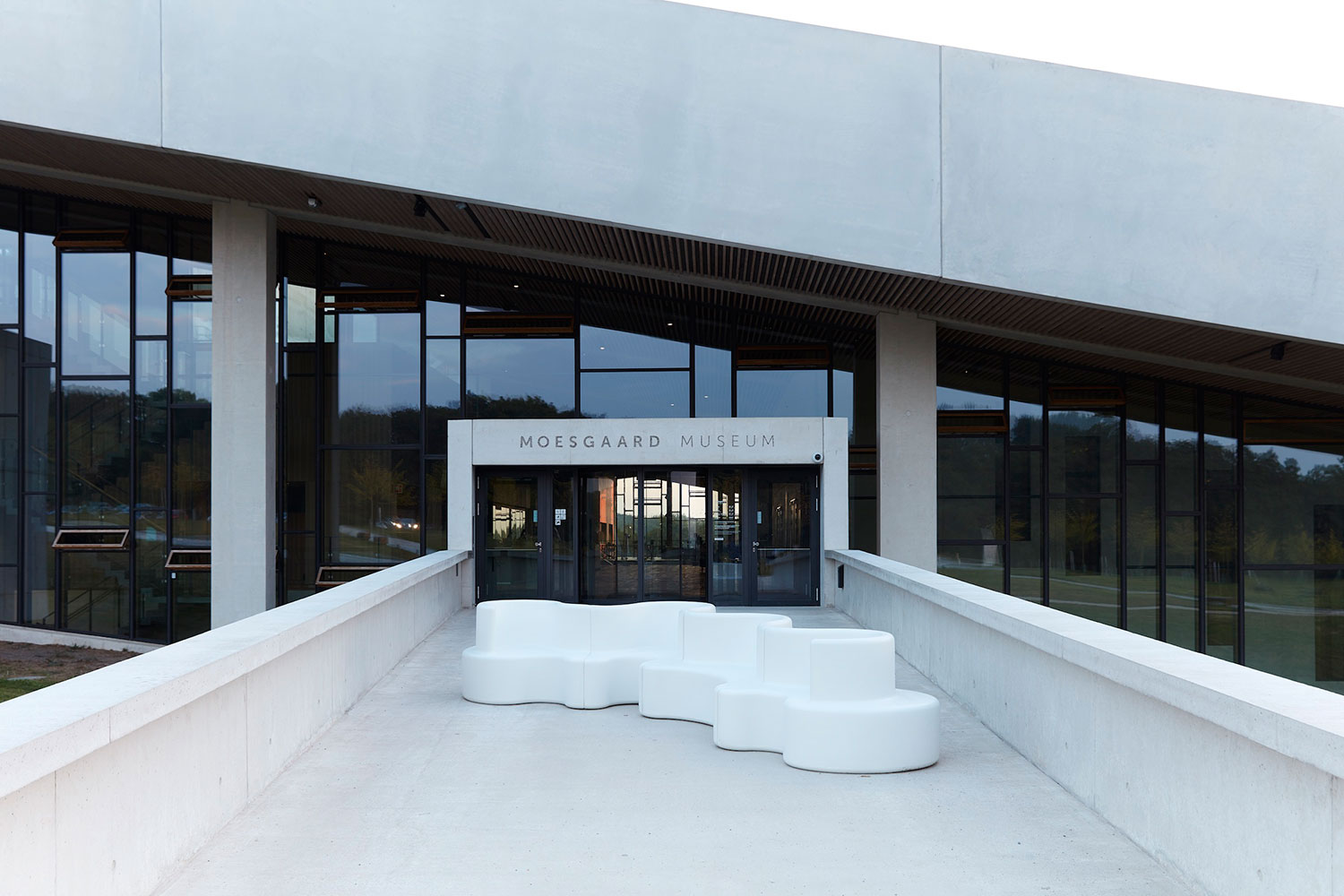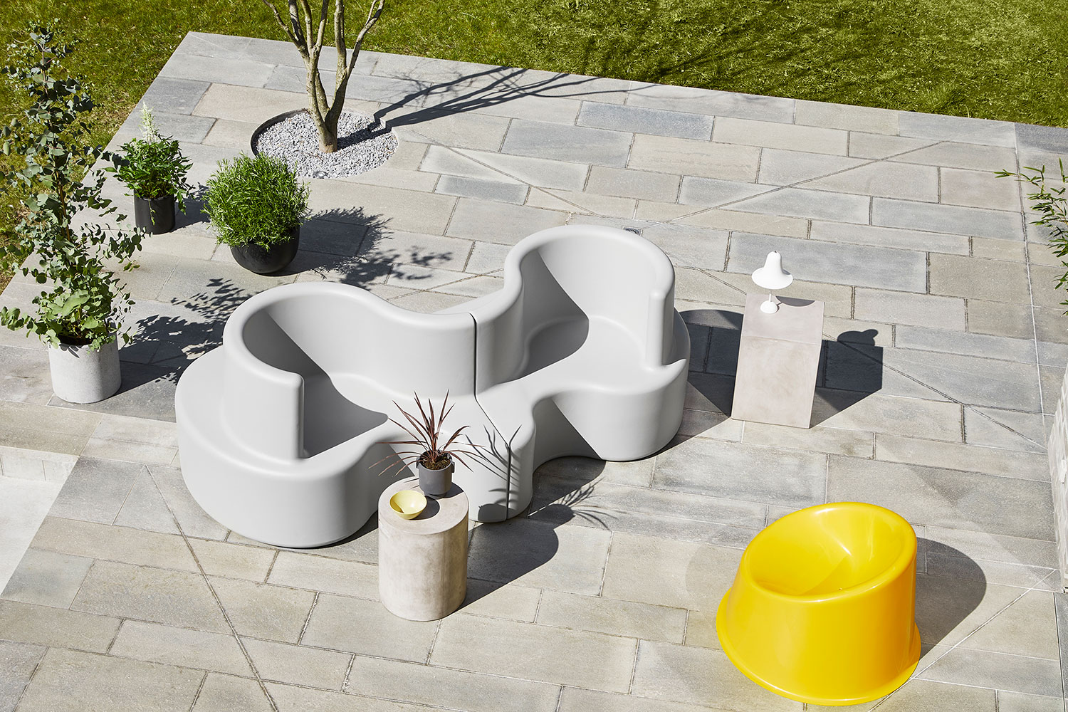 The sofa is a multidirectional, modular sofa made for both in- and outdoor use. The backrest in the middle of each module can either provide privacy or open up to conversation.