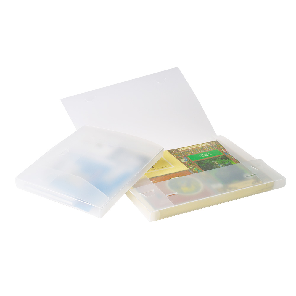 Combination box for library materials consisting of several types of media such as e.g. a book and a disc.