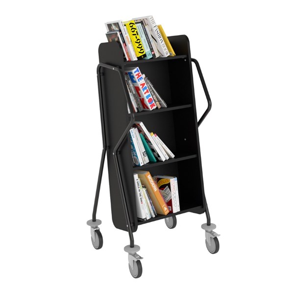 Ergonomic, user-friendly, single-sided book trolley with 4 shelves. Generous amount of clearance between shelves to accommodate larger books.