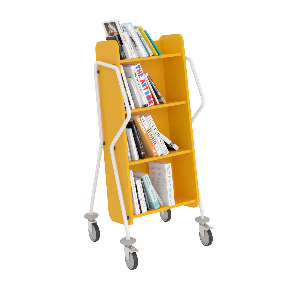 Ergonomic, user-friendly, single-sided book trolley with 4 shelves. Generous amount of clearance between shelves to accommodate larger books.