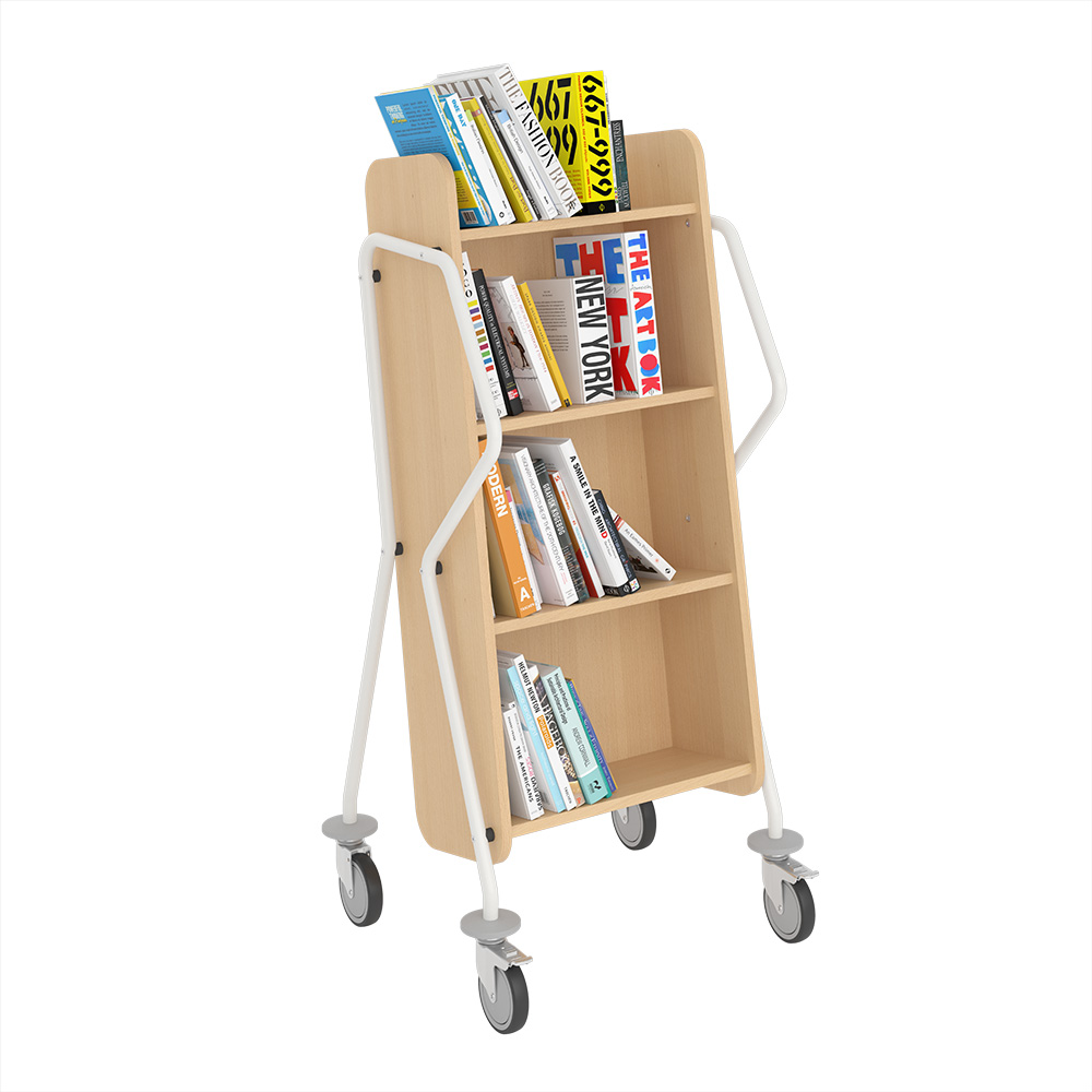 Ergonomic, user-friendly, single-sided book trolley with 4 shelves. Generous amount of clearance between shelves to accommodate larger books.