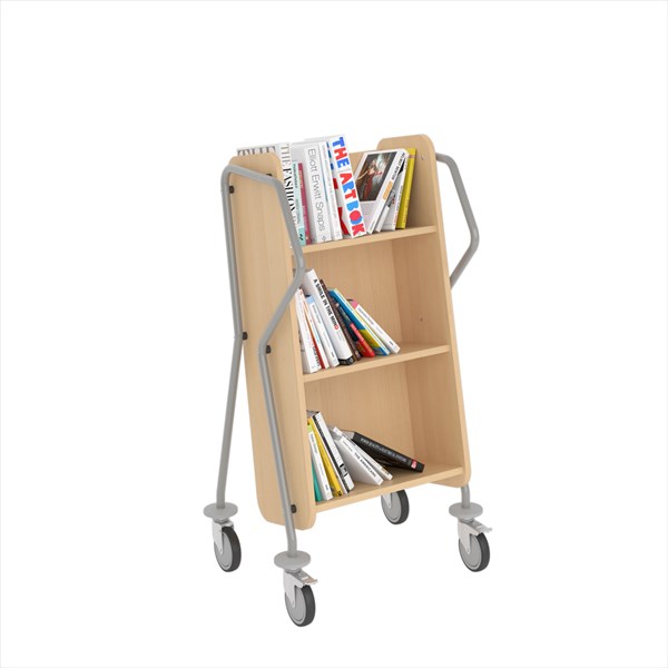 Ergonomic, user-friendly, single-sided book trolley with 3 shelves. Generous amount of clearance between shelves to accommodate larger books.
