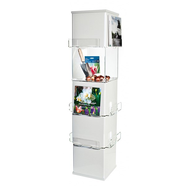 Smart display and exhibition tower for front-facing display of books, magazines and exhibited objects.