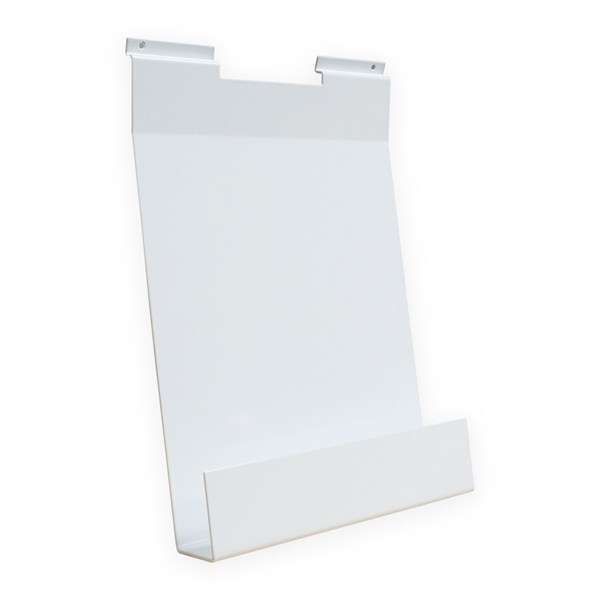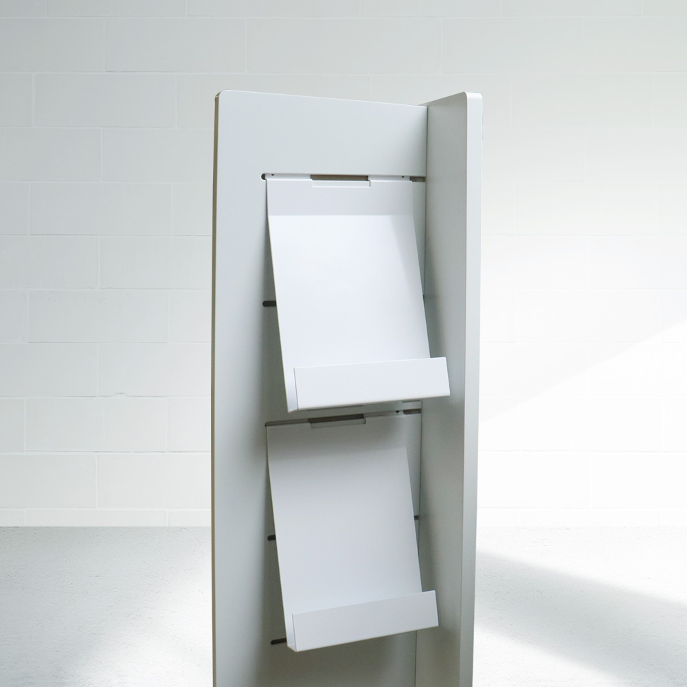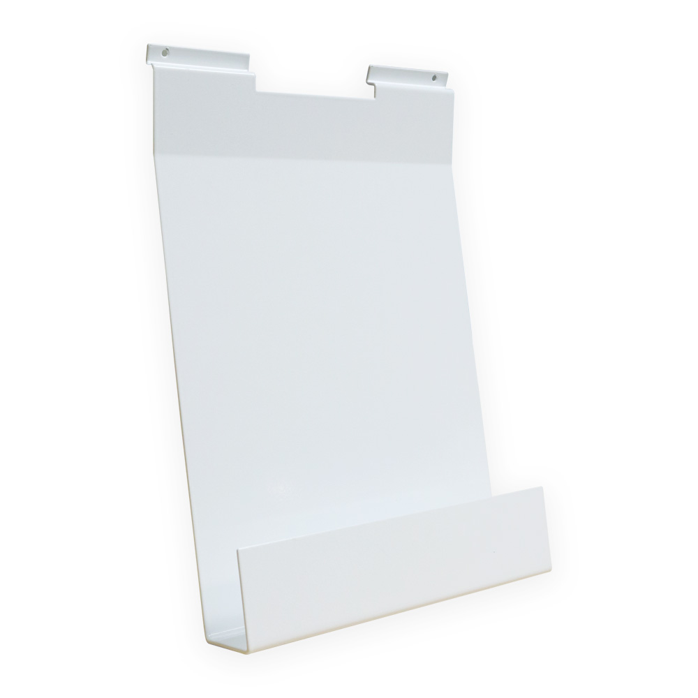 A collection of solid steel holders suitable for slat display panels and Quattro book tower.