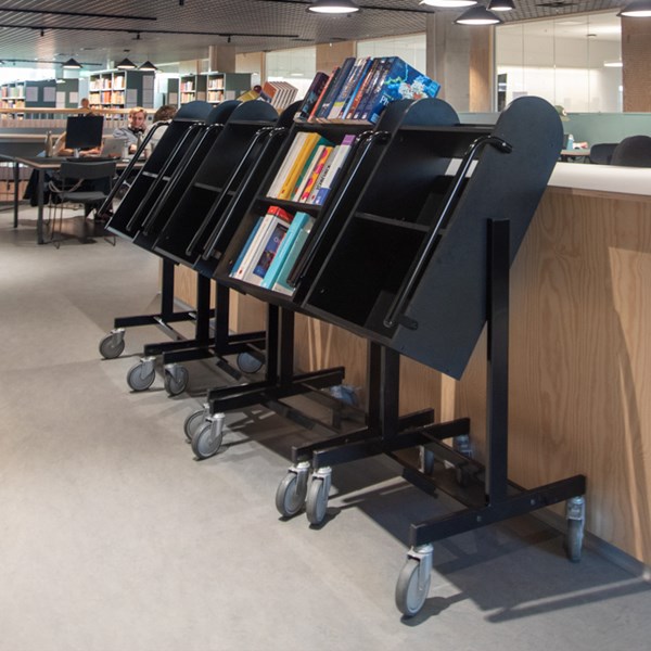 Elevated storage reduces wear on back and joints. A welcome transportation trolley in all libraries.