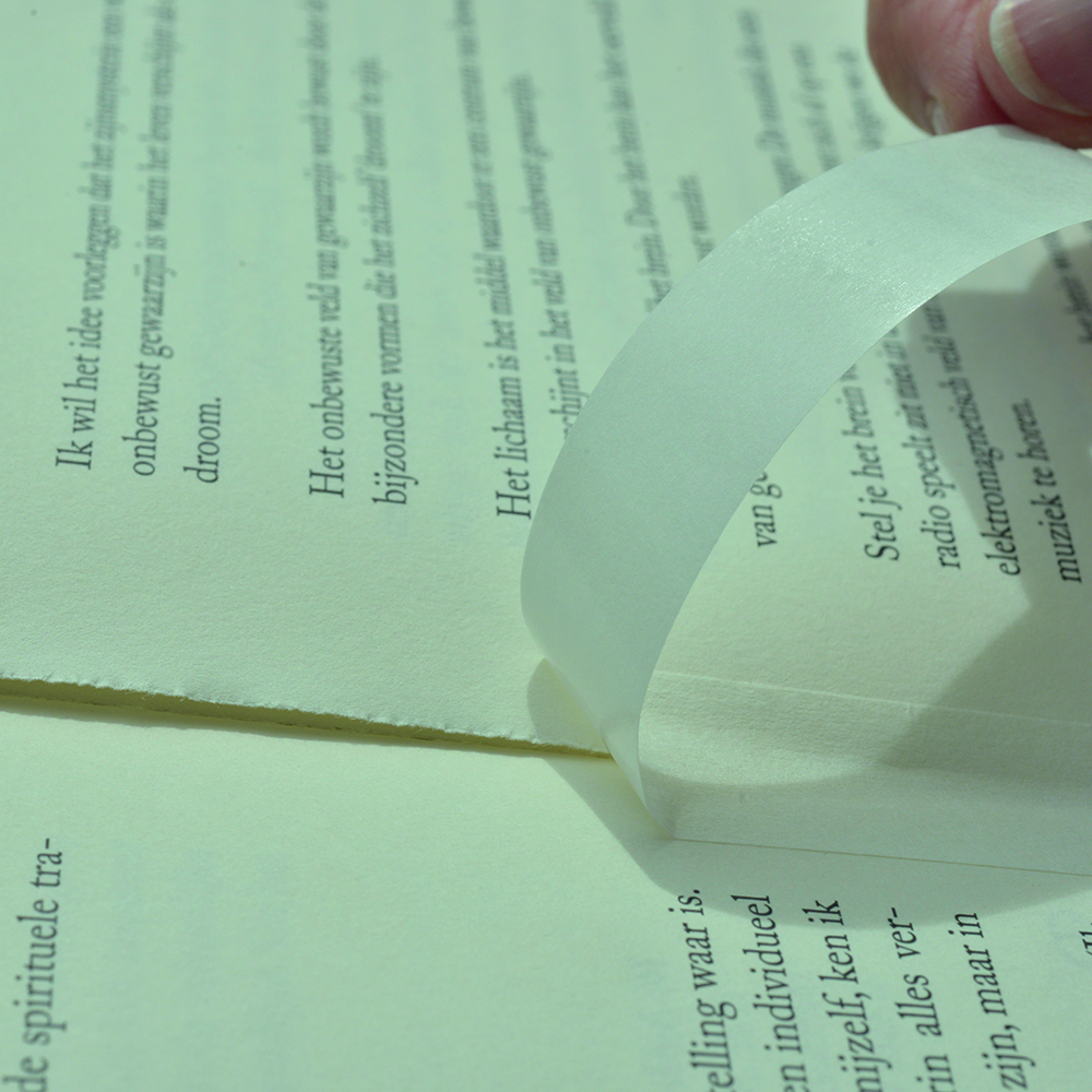 Ideal for strengthening the joint between book cover and book body with high adhesive strength and strong tear resistance. It is hardly visible and very flexible, ideal for gluing into the fold. For fixing pictures, photographs and prints to passe-partouts or rear mounts. For dust-free sealing of rear mounts.