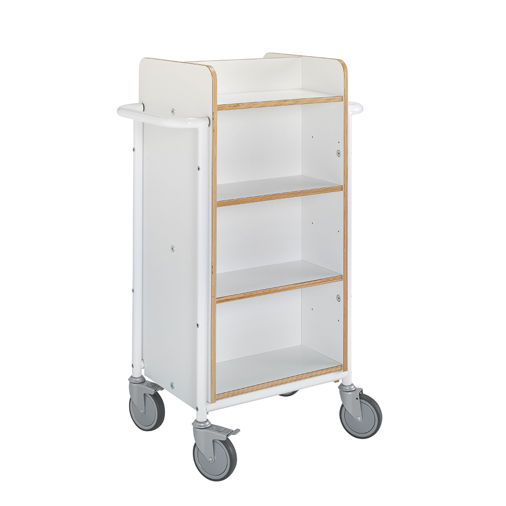 Functional, double-sided book trolley with 8 shelves. 6 shelves are adjustable to accommodate various media sizes.