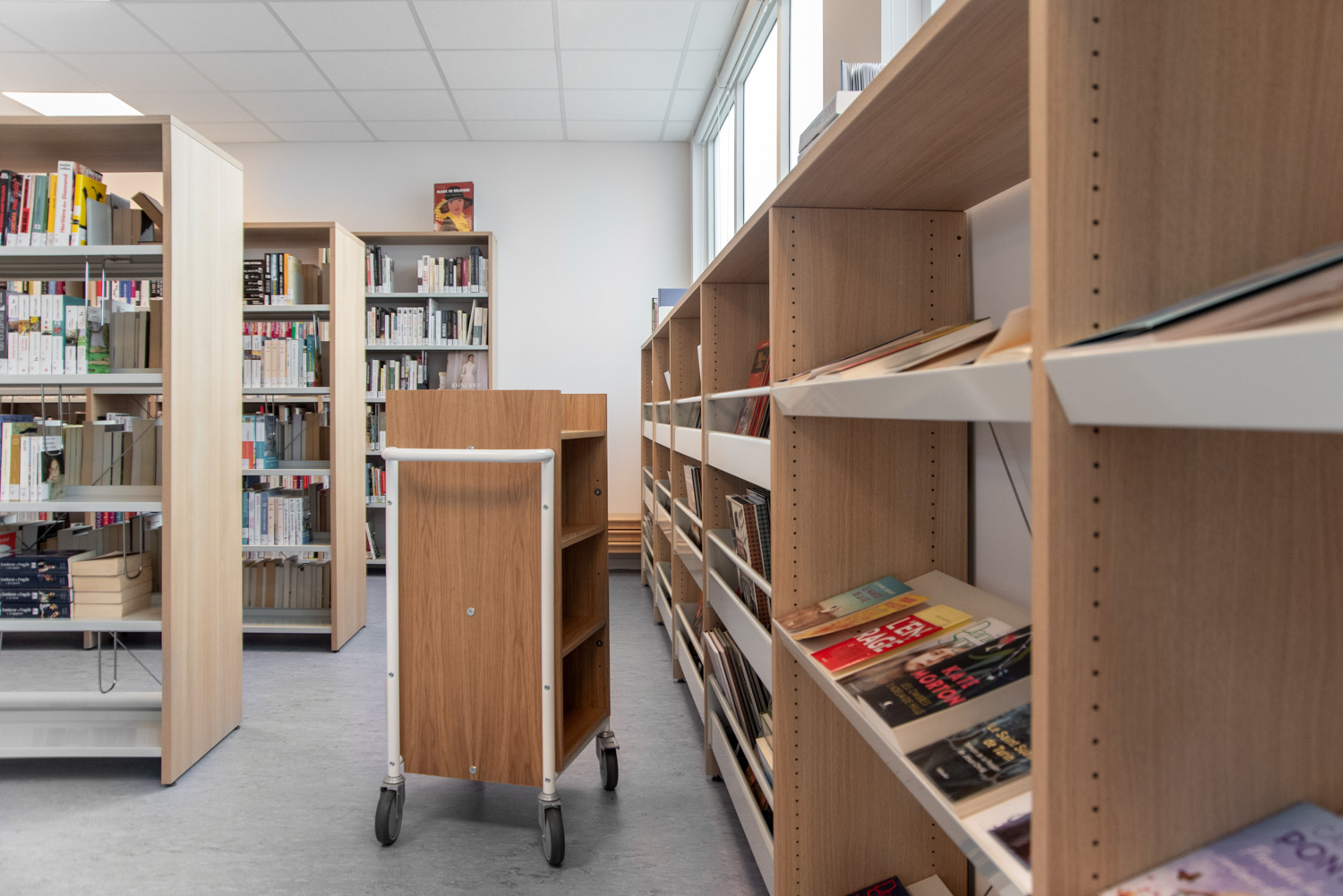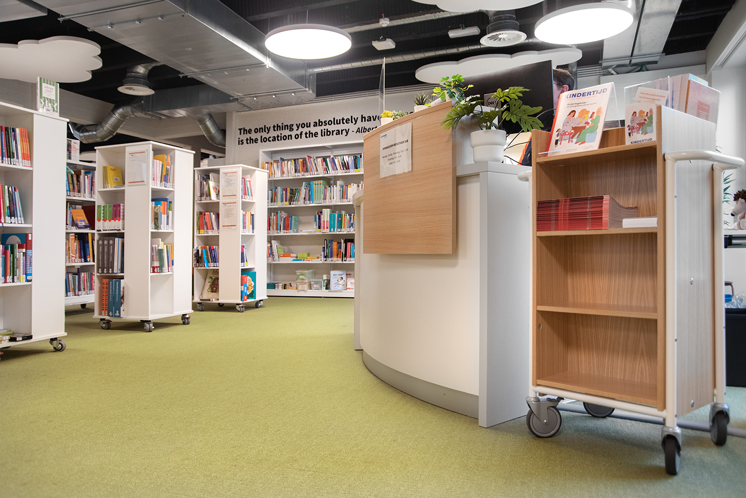 This book trolley can be used as a mini shelving system that can be moved around in the library where needed.