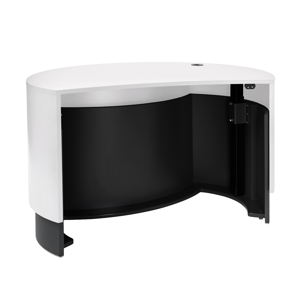The height adjustability (electric) meets many health and safety guidelines and the recessed front with increased accessibility allows the visitor to come closer regardless of whether he/she uses a wheel chair (low position) or a rollator (high position).