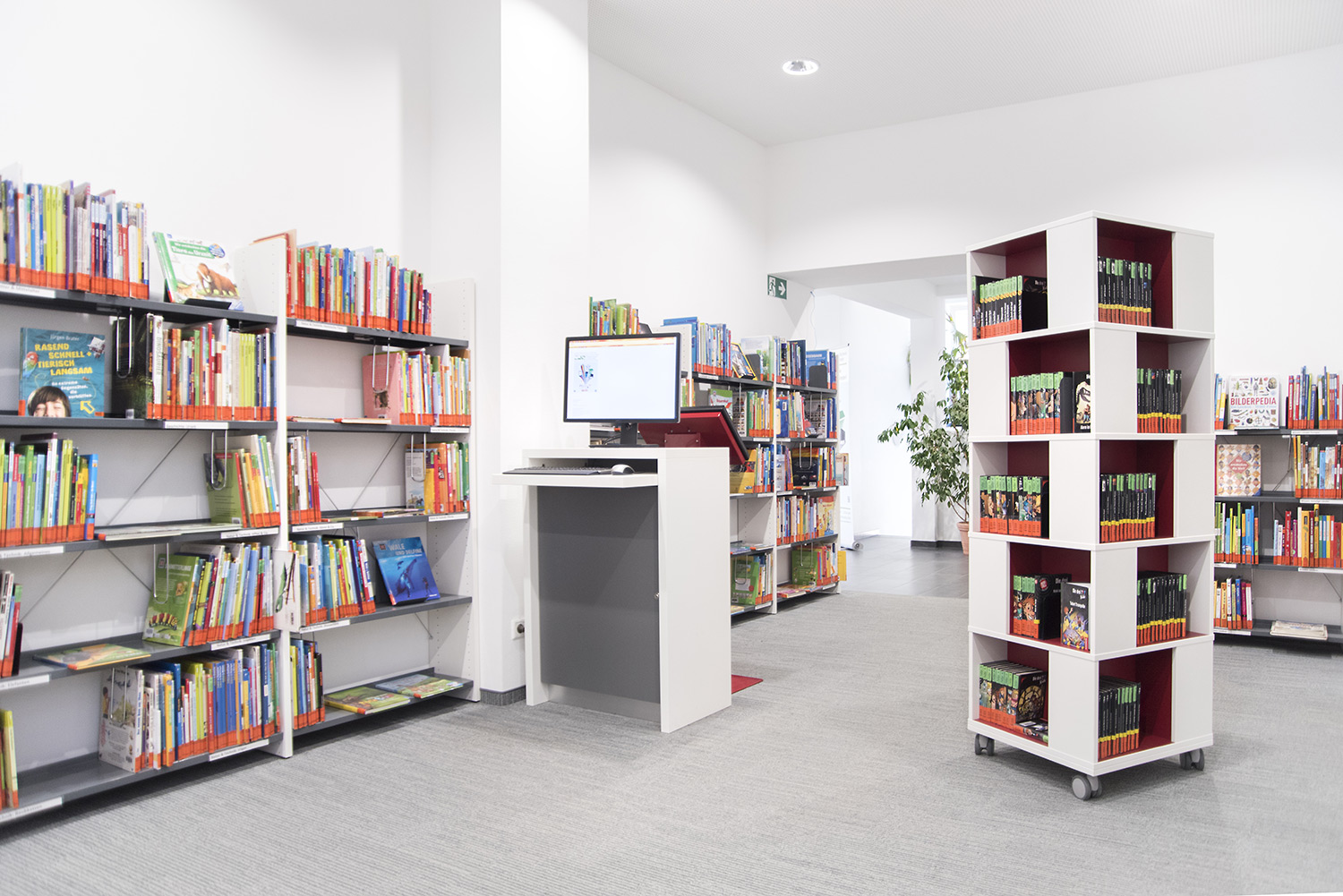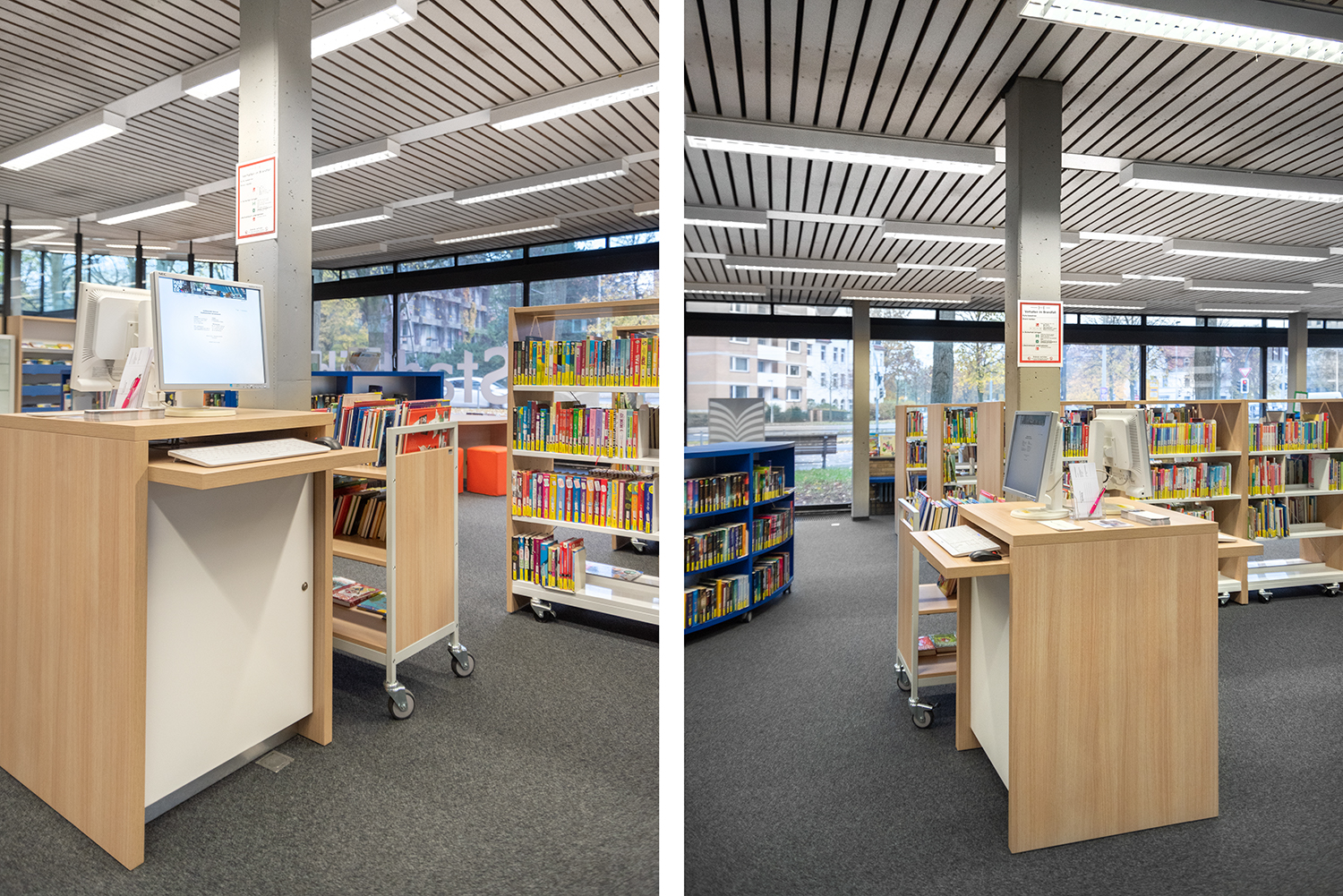 The lockable cabinet houses the CPU and sufficient ventilation is provided by the recoiling base and the sophisticated air and cable conduct. The monitor sits free standing on the OPAC station, but can alternatively be fixed to the OPAC station with a separate console. This piece of furniture can be used free-standing, as it can be equipped with a back board (single-sided only) in a different colour.
