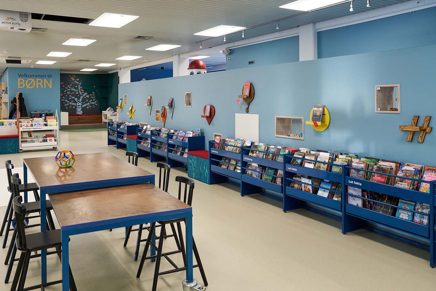 Today, the children’s area occupies a significant part of the library—both physically and experientially. A larger, more cohesive environment has been created, with a long communal table acting as a natural focal point for play, immersion, and shared activities.