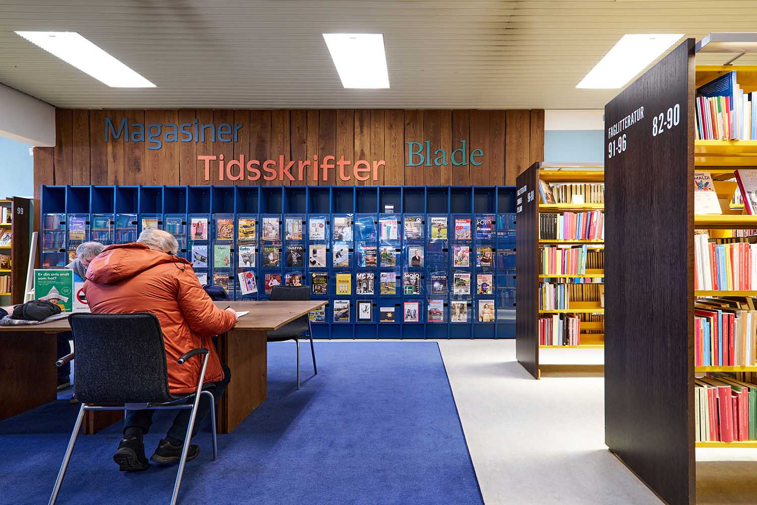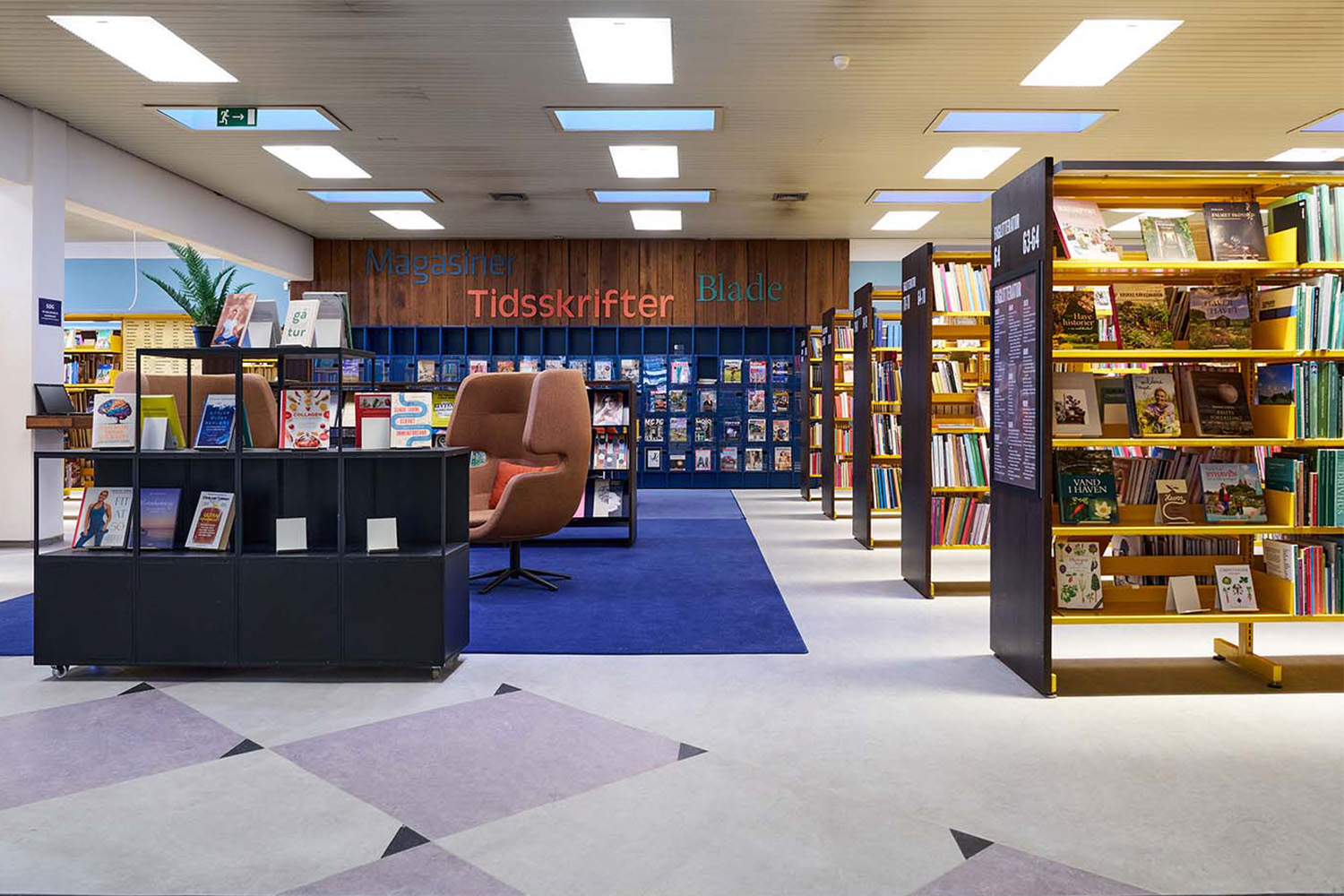 Shelving has been rebuilt into smaller, mobile sections on castors, making the library flexible and easy to reconfigure for events and changing needs. Throughout the library, carefully selected wall colours, graphic solutions, and carpets have been introduced to give the entire building new life. The richly coloured carpets, with thoughtfully chosen patterns, help create a vibrant and inspiring library while adding a homely sense of comfort that opens the spaces and makes it feel welcoming.
