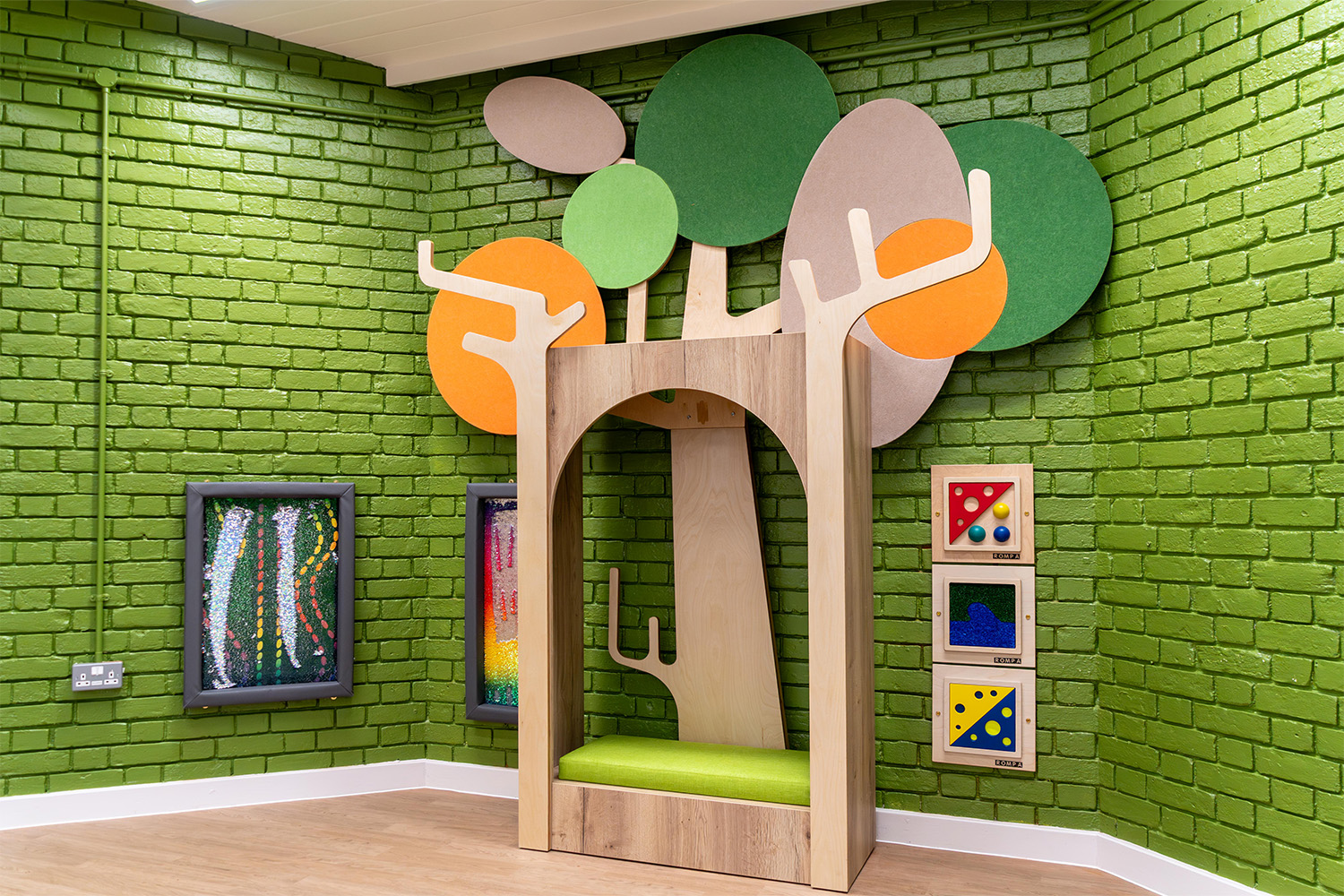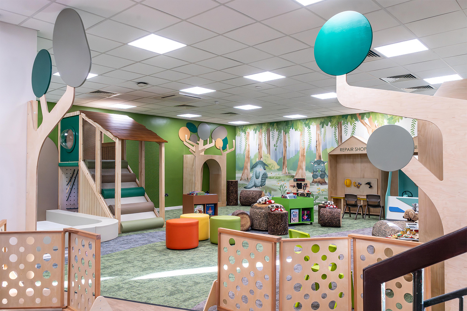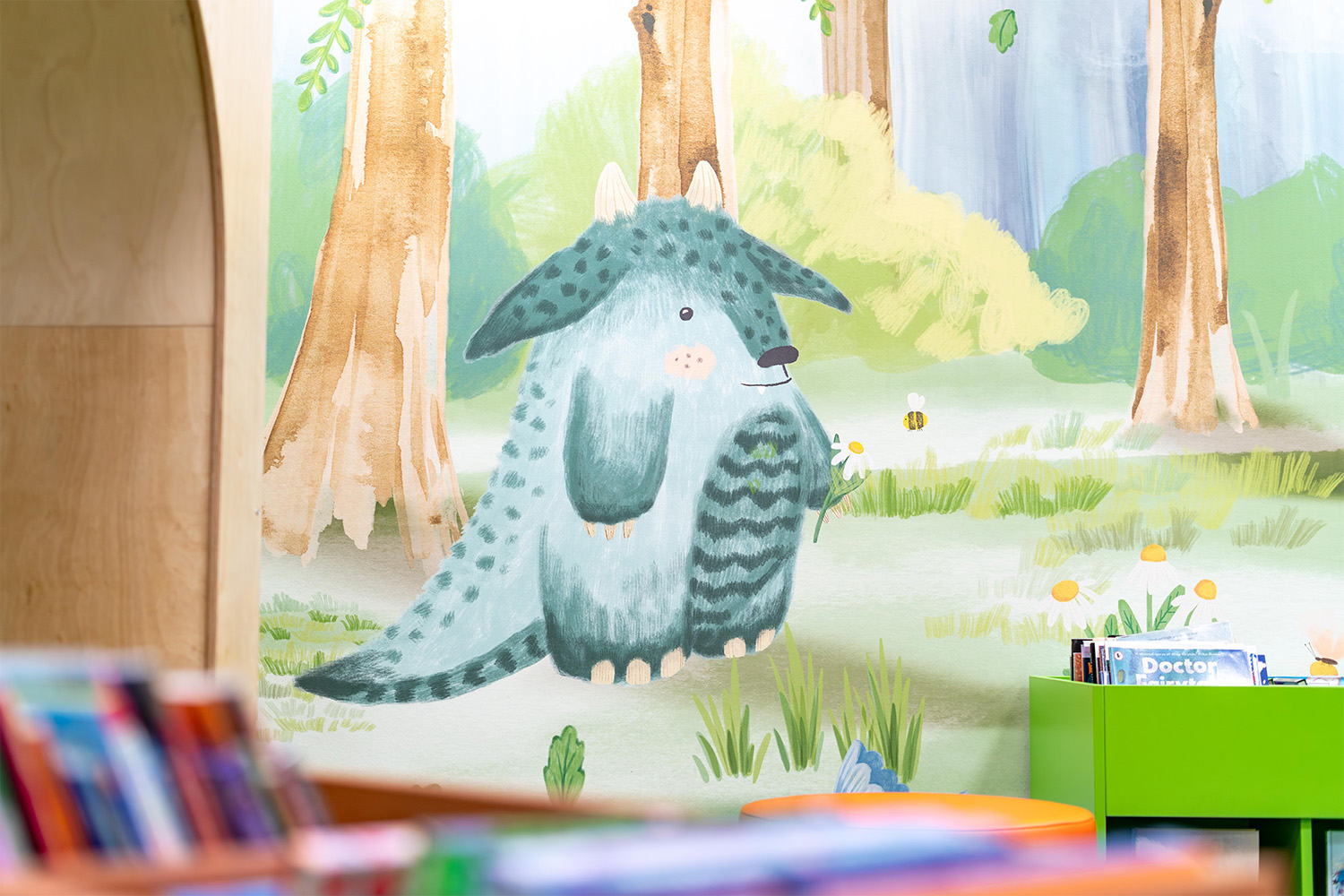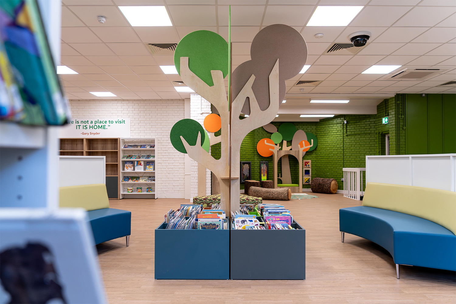 Pops of colour and layered textures enhance visual interest, while custom upholstery features across furniture, shelving, and bespoke elements elevate the overall design. Graphic finishes integrated into shelving and children’s furniture boost creativity and energy, particularly within the forest-themed imagination space; home to friendly characters like Fuzzlehog.