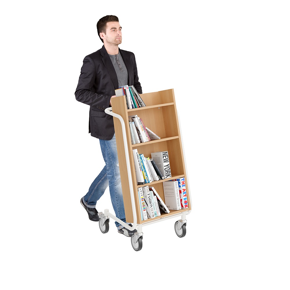 User-friendly, single-sided book trolley with 4 shelves. The two middle shelves are adjustable to accommodate various media sizes.
