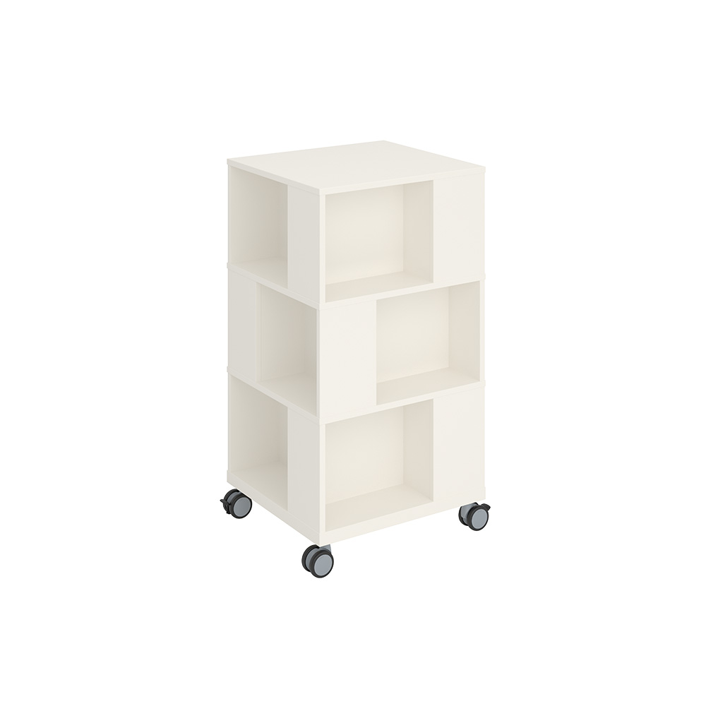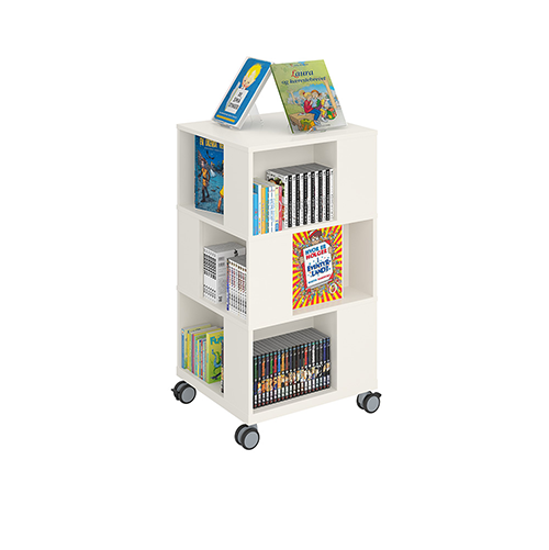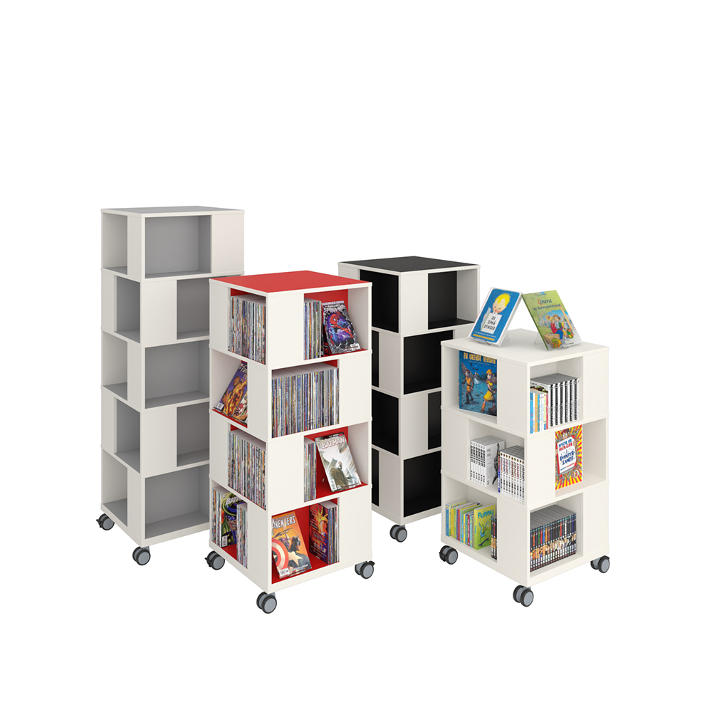 Freestanding mobile tower combining display with storage. Good capacity with 4 compartments per level.