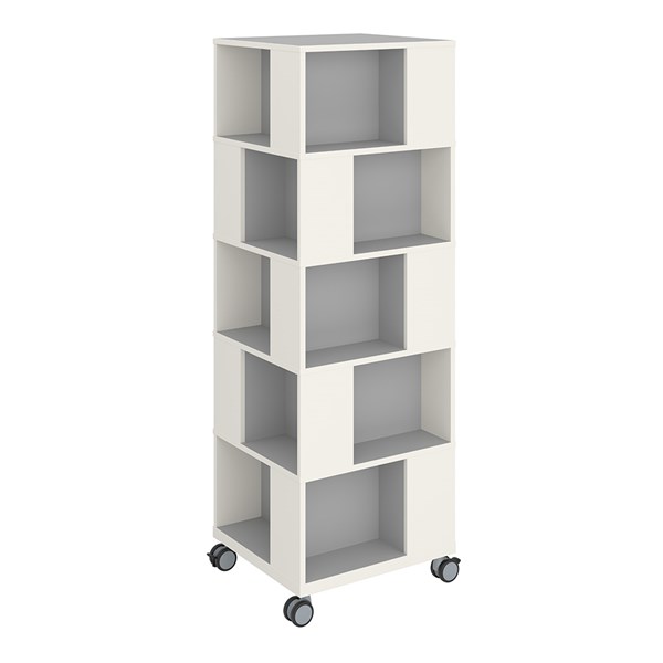 Freestanding mobile tower combining display with storage. Good capacity with 4 compartments per level.