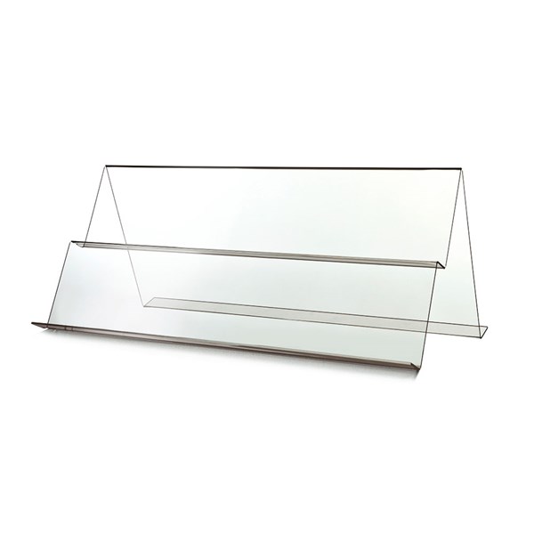 Stackable, double-sided 2-tiered acrylic display stand with high capacity.