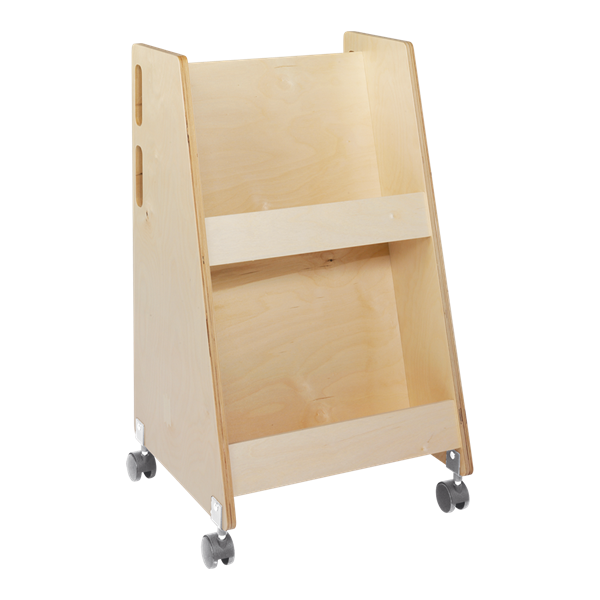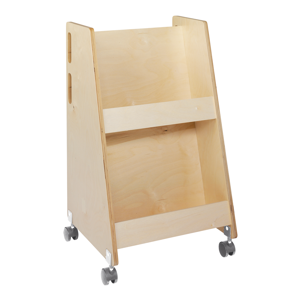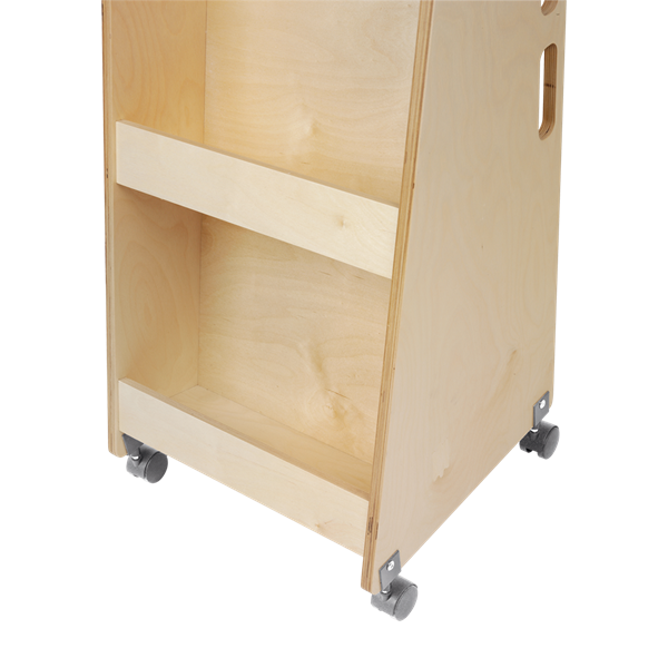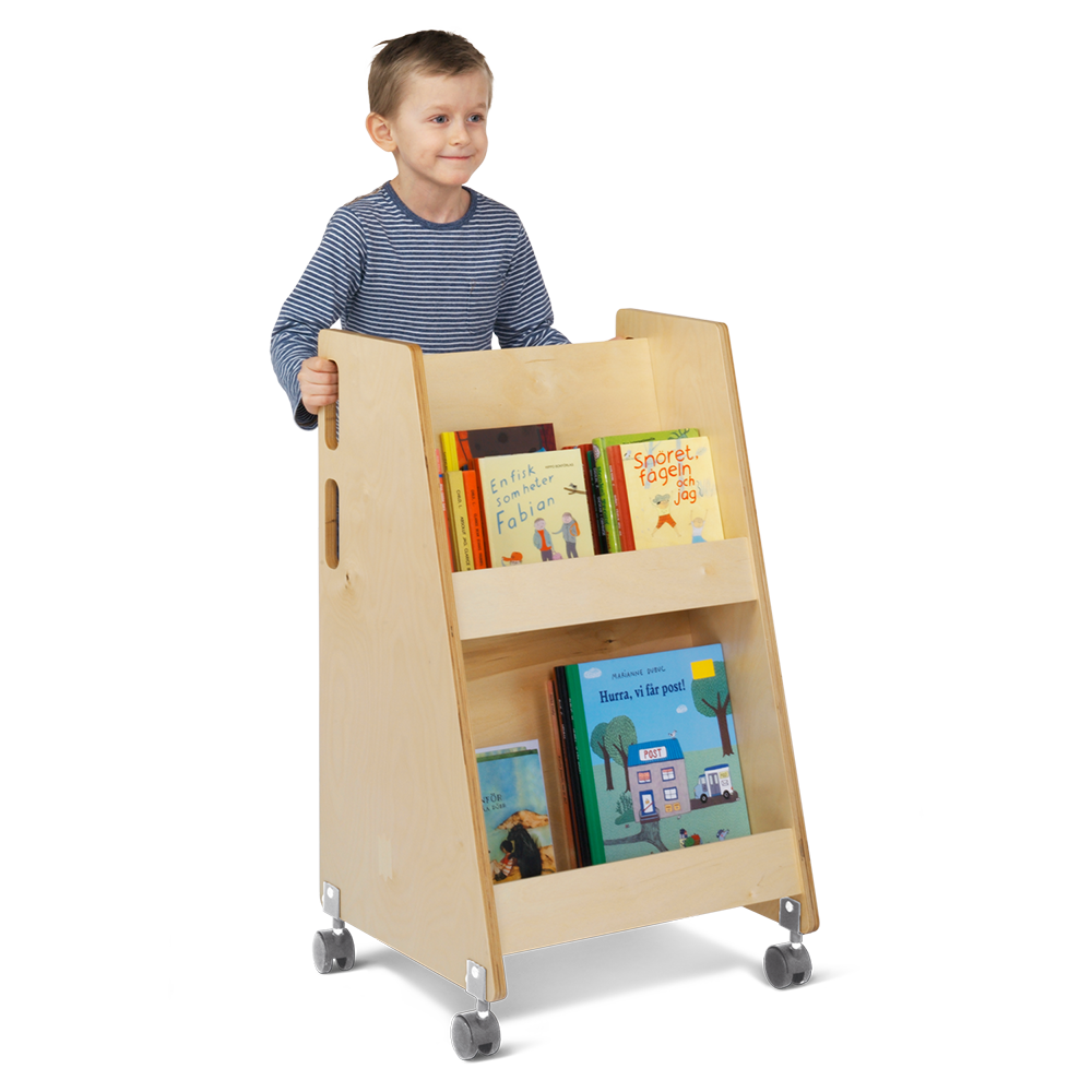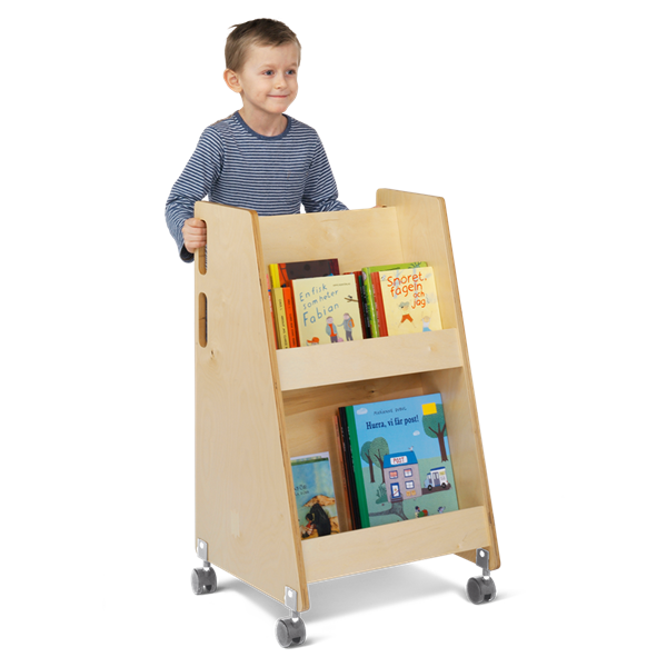 Compact book trolley made of birch plywood with 2 fixed shelves with front edge for front display of picture books, for example.