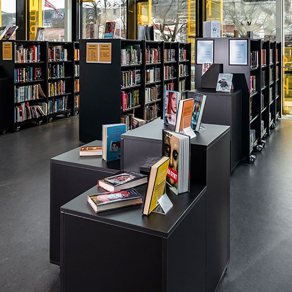 All-round front display of books, literature, AV-media such as CDs and DVDs, etc.