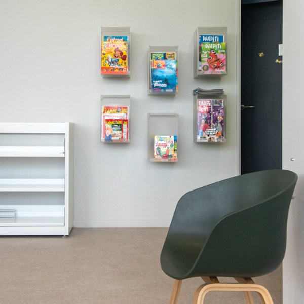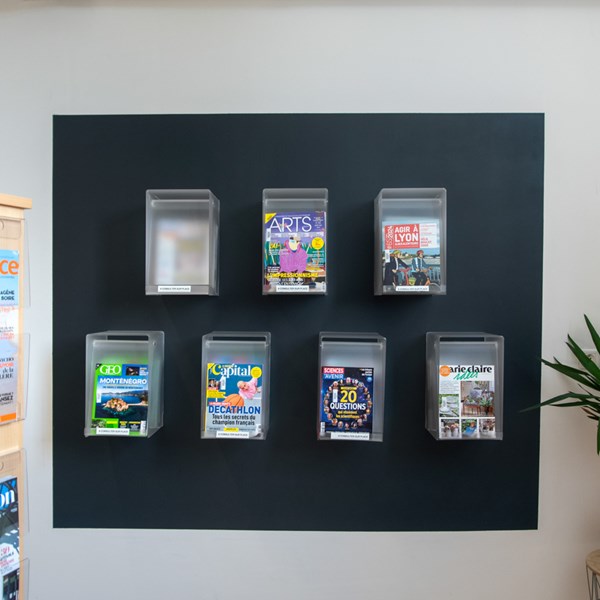 Current magazines and periodicals are stored in a compartment behind the flap (lift and insert) and the fold-down lid also serves as a display holder for the latest issues.