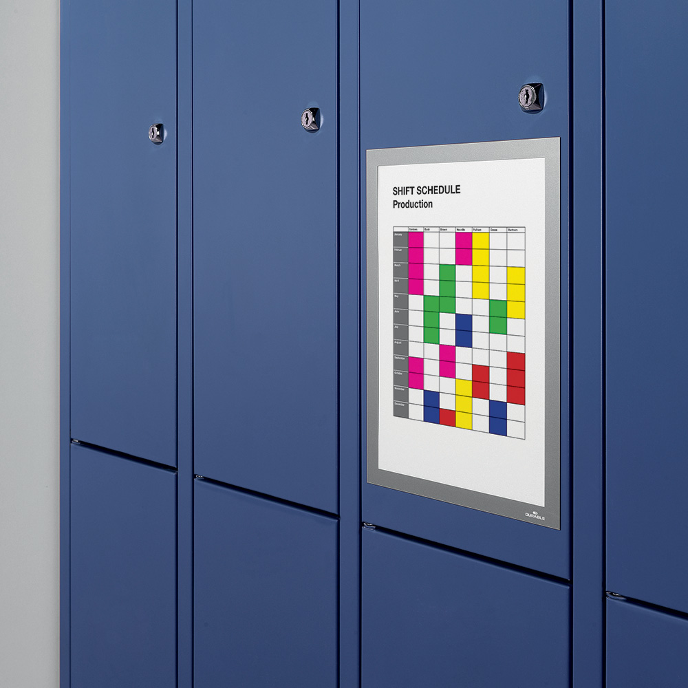 The magnetic frames (Duraframe® Magnetic Plus) attach to all magnetic surfaces such as whiteboards, metal shelf panels, etc.