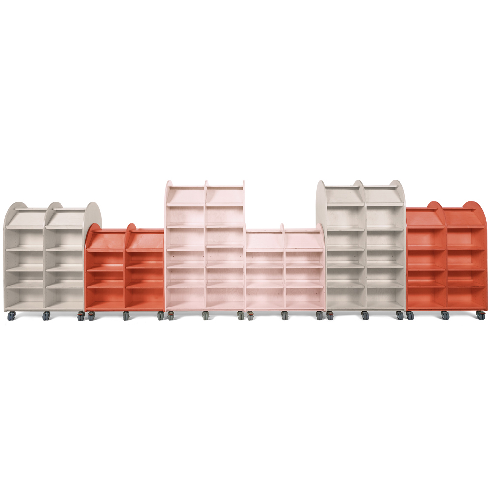 Build inspiring “urban spaces” with buildings of different heights and depths. Invite visitors on a walk around town along the building façades with inviting “display windows” full of books, magazines and much more! Ideal as focal points for all visitors.