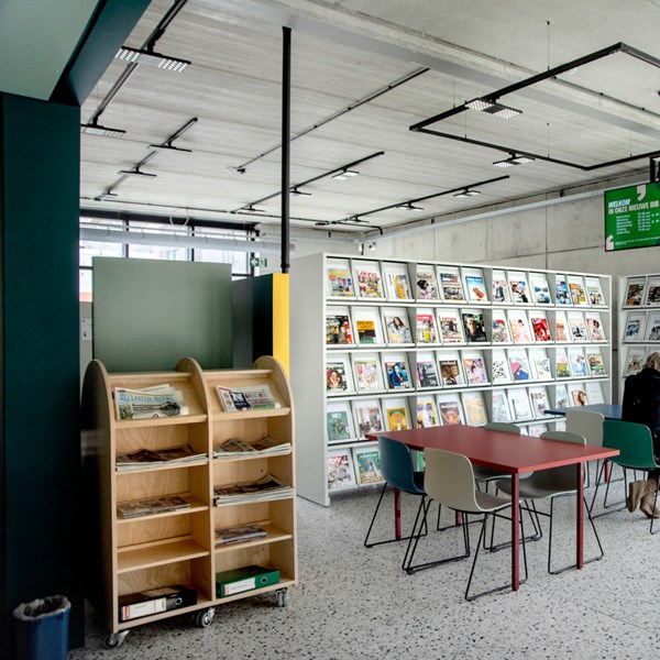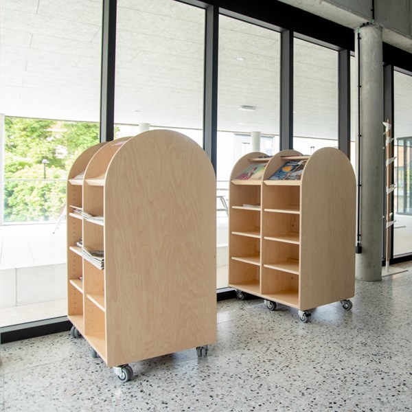 Build inspiring “urban spaces” with buildings of different heights and depths. Invite visitors on a walk around town along the building façades with inviting “display windows” full of books, magazines and much more! Ideal as focal points for all visitors.