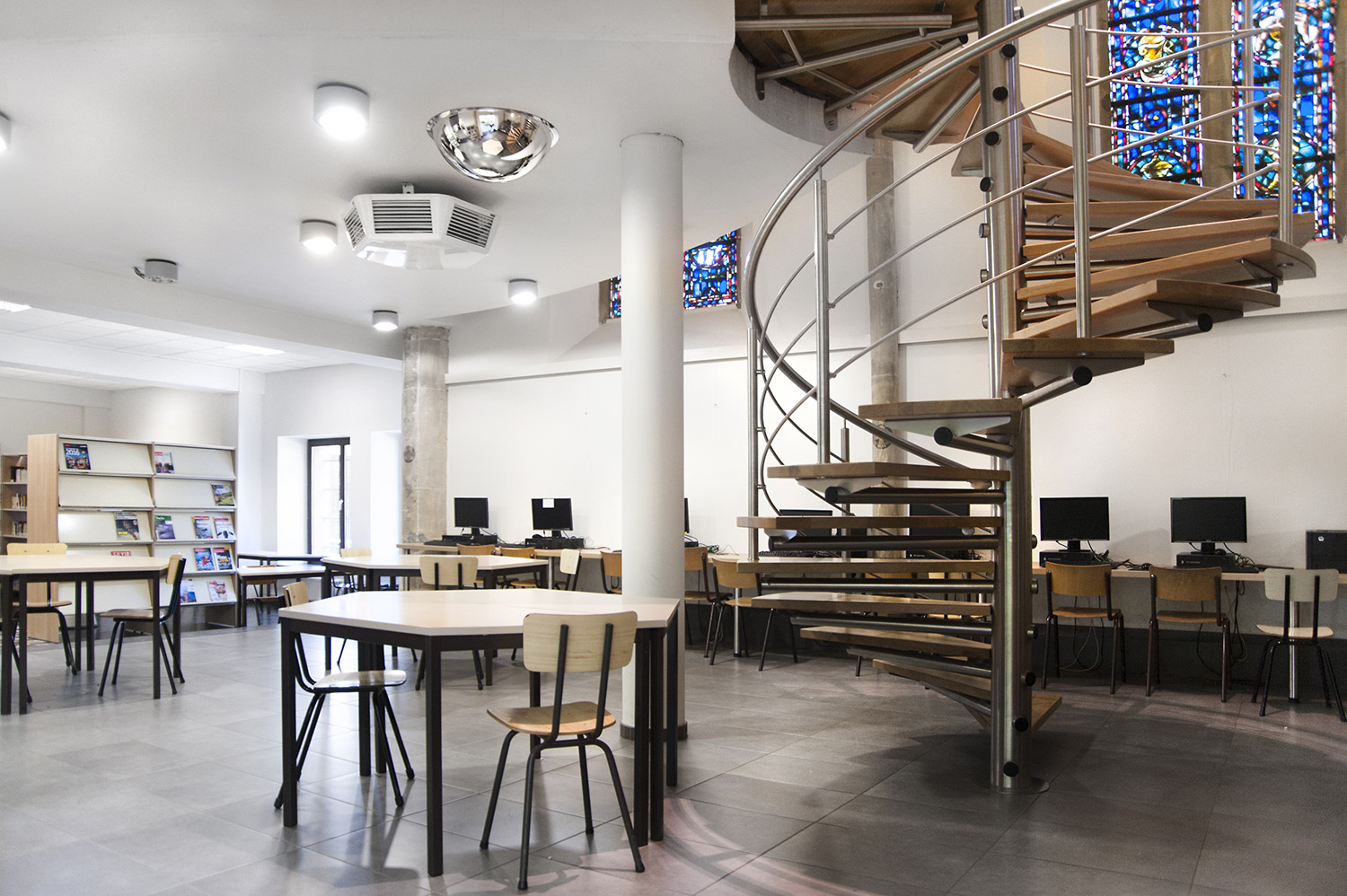 In 2010 INDSé (Institut Notre-Dame Séminaire) school library moved into an old chapel but there was a big difference between the new environment and the old furniture, both practically and aesthetically. While redesigning the interior we needed to take into account two requirements: the location and the way of use. Because the library is situated in an old chapel, is was very important that the architectural elements could be preserved. It was also important that the space could serve as classroom because teachers sometimes teach in the library while the students can collect some documentation.
