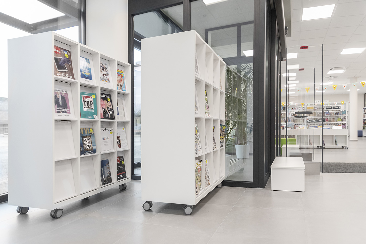 The Begijnendijk library wants to be more than a mere collection of books. Councilor Bob Michiels points out the flexible design: "The furniture is so functional that it can be easily pushed aside to make room for lectures or other cultural activities". Both the shelving and the book browsers are equipped with wheels so that they can be easily moved. Mr Fred De Keyser, chairman of the library board, is also pleased with the realization in the heart of the town. "A library should be at the forefront of the information revolution, and the new building and the whole new concept were the perfect occasion to set the right lines: becoming a meeting and experience center with room for modern media and techniques".