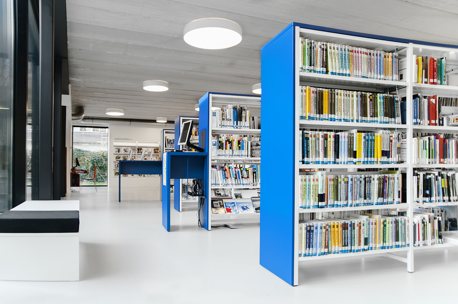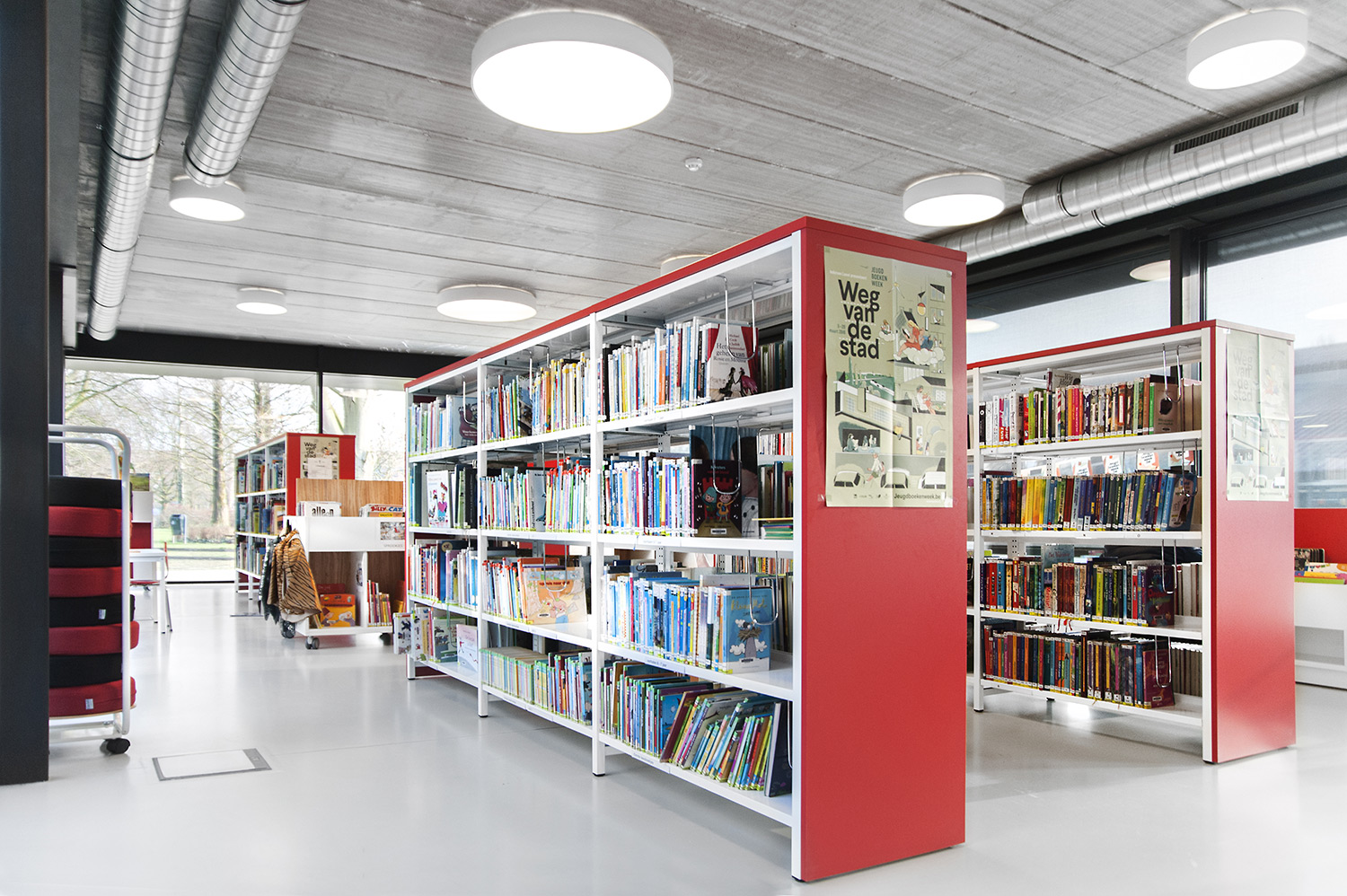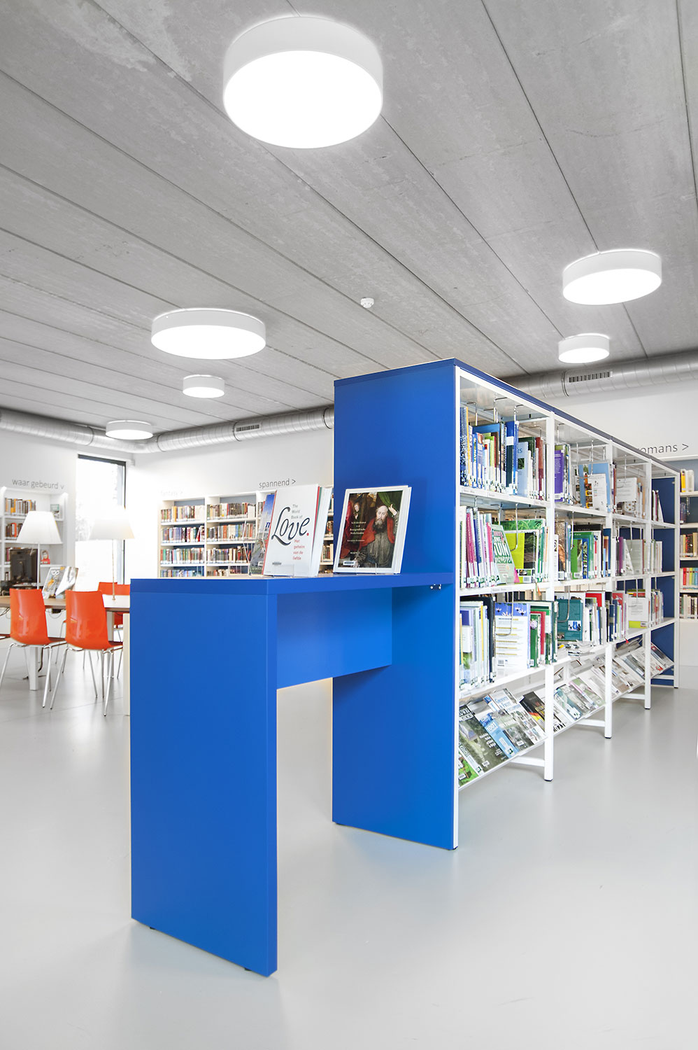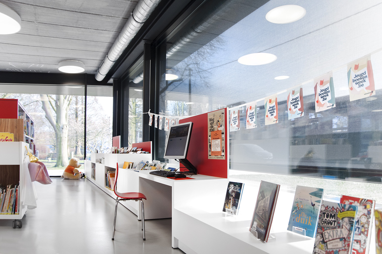 Abundant natural light and views to the park form the basis for a pleasant library in a modern, timeless design. Some colour accents make a link with the various target groups. Shelves were encased to maintain the tight design.