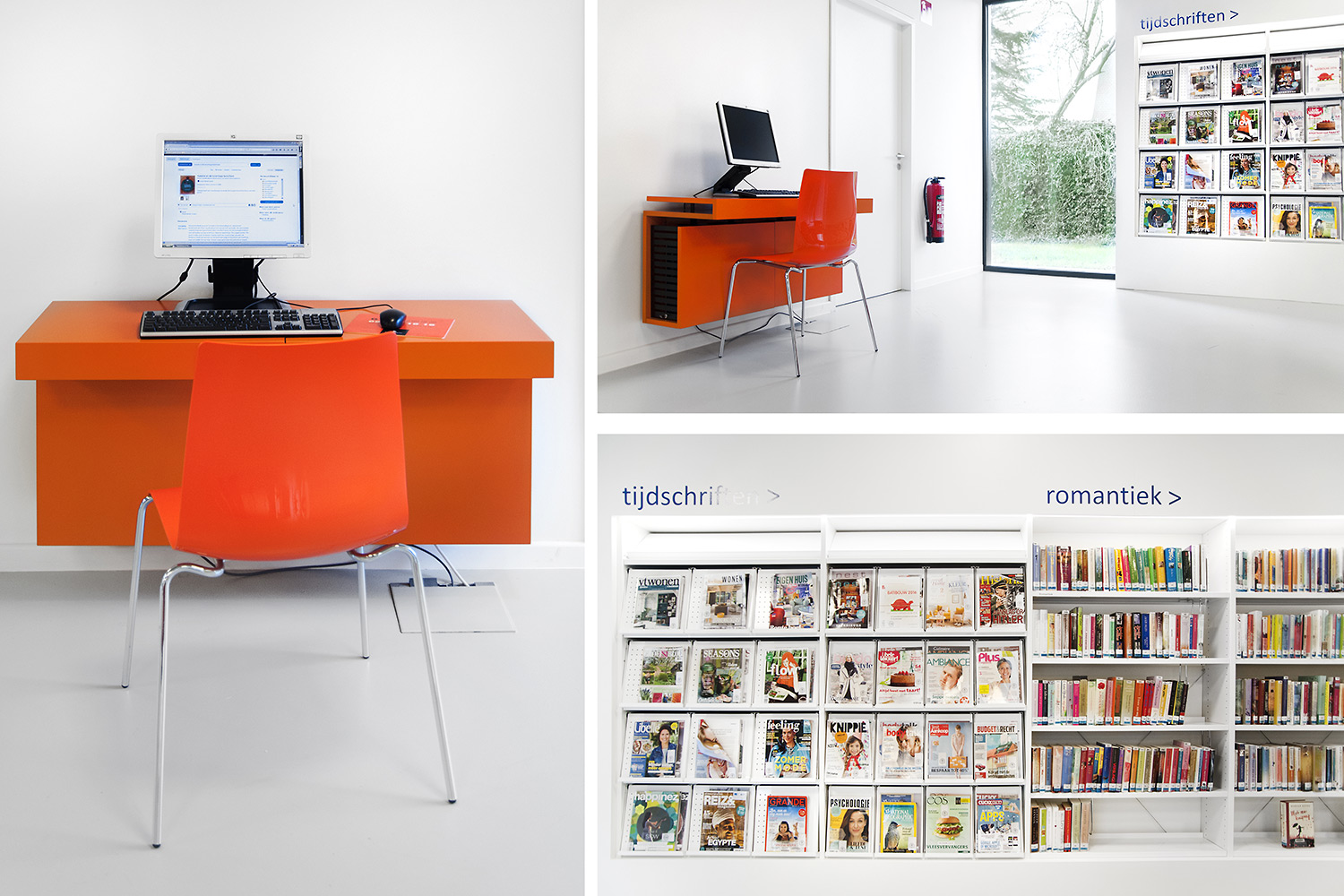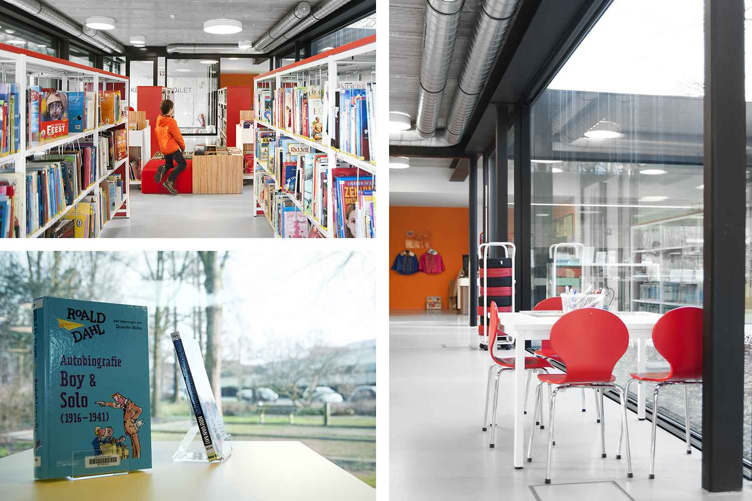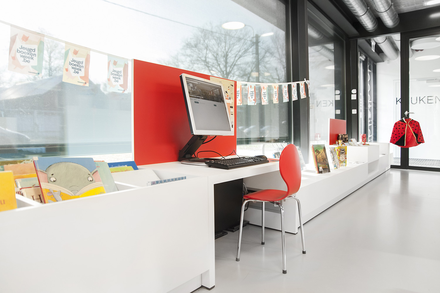 Abundant natural light and views to the park form the basis for a pleasant library in a modern, timeless design. Some colour accents make a link with the various target groups. Shelves were encased to maintain the tight design.