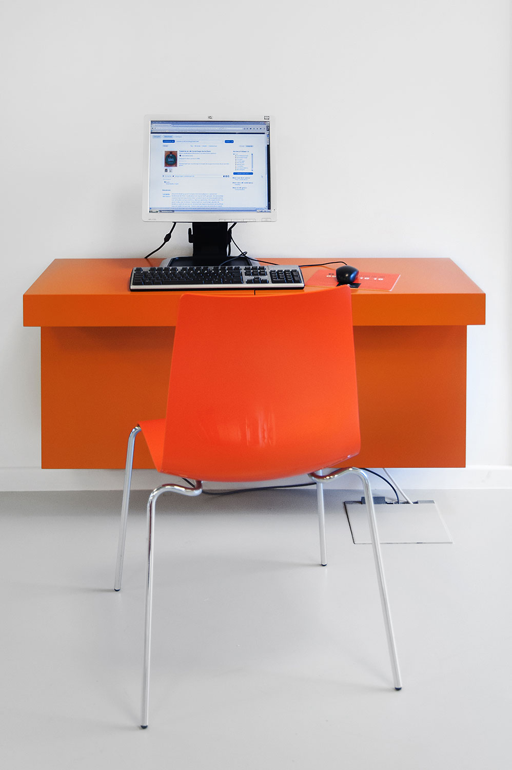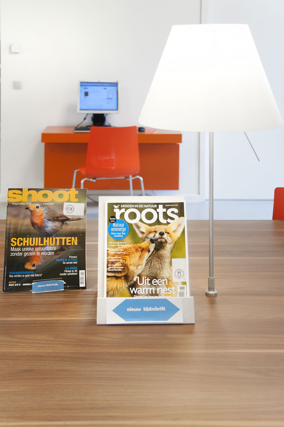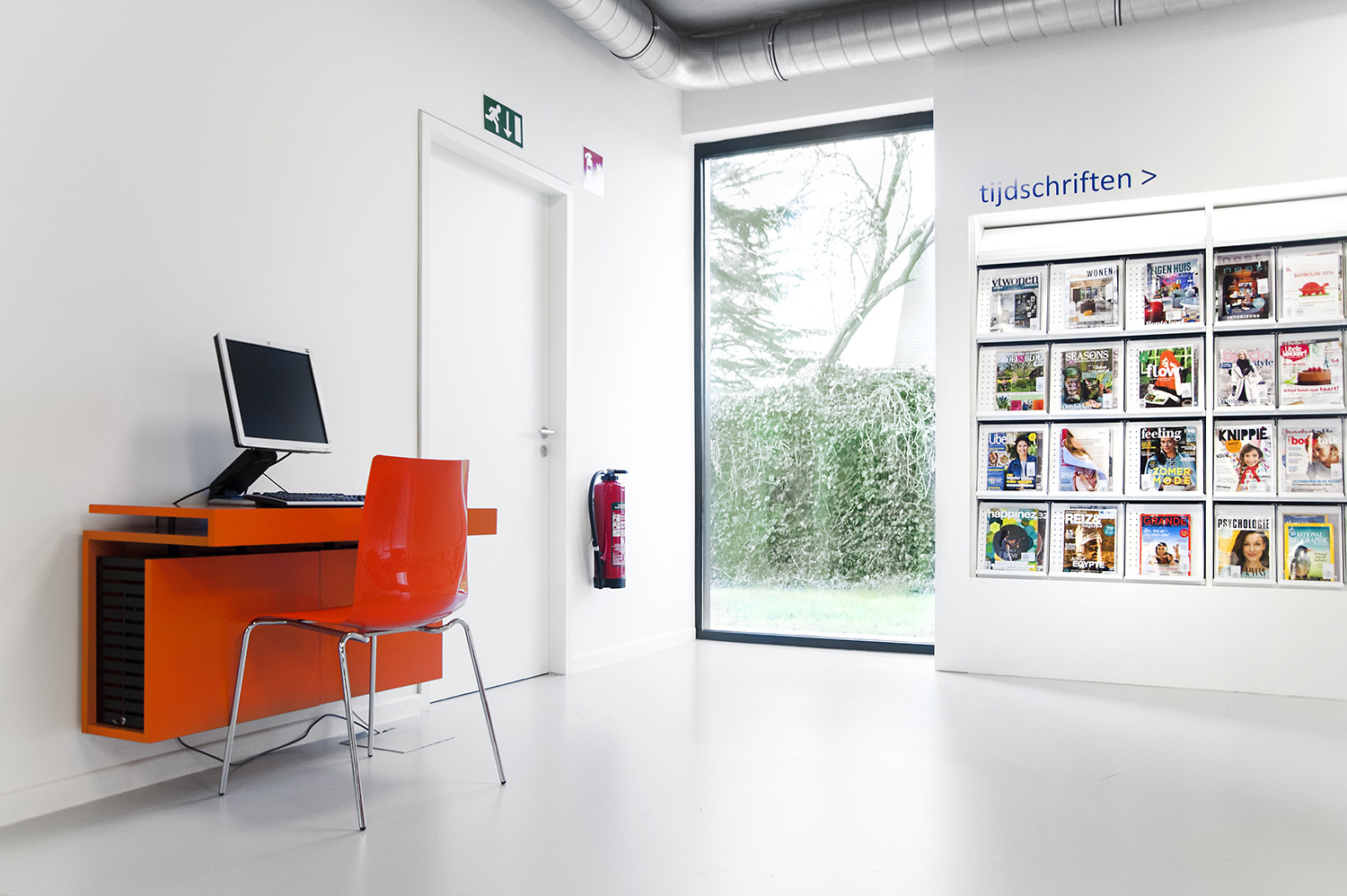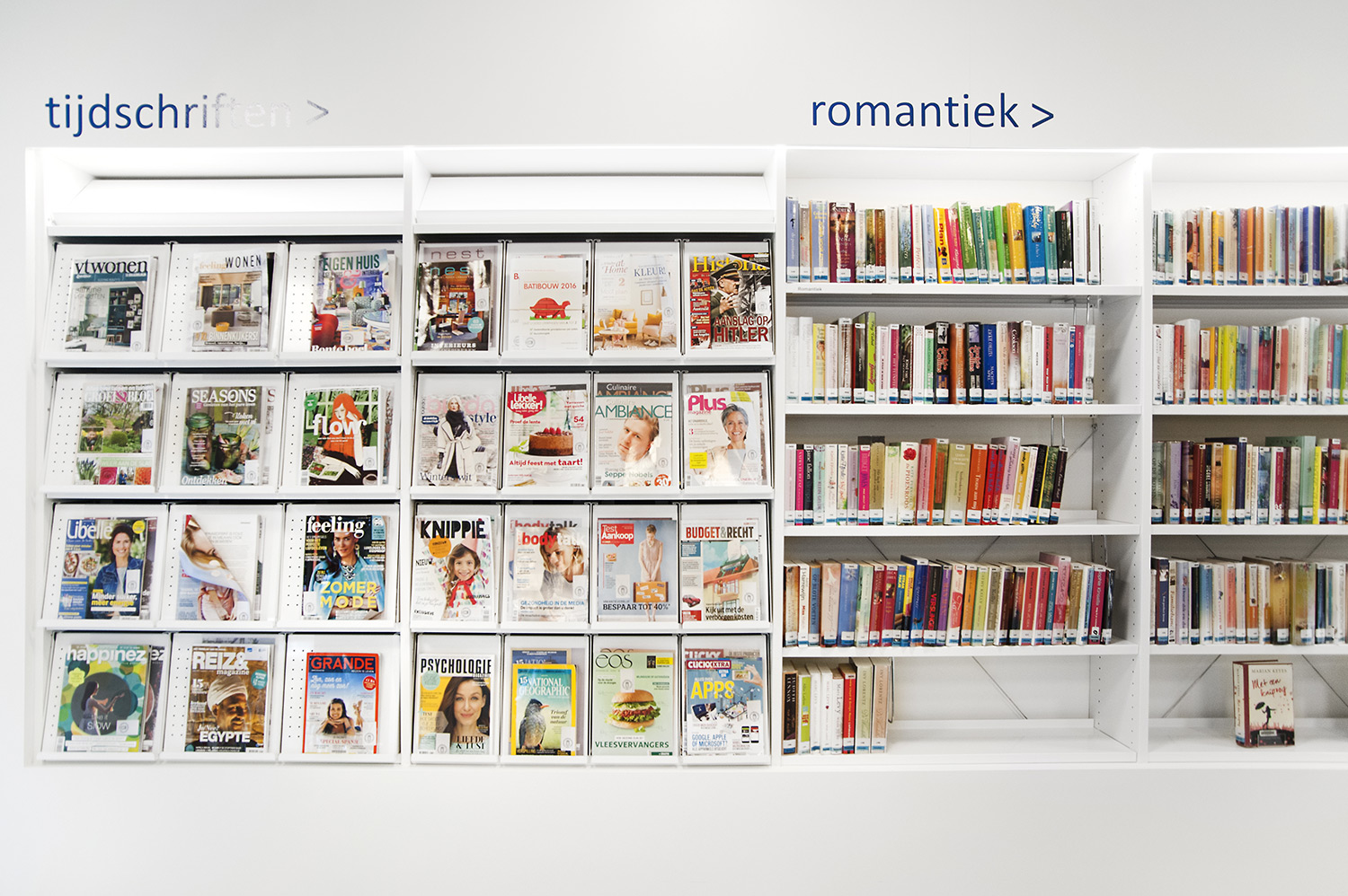 Abundant natural light and views to the park form the basis for a pleasant library in a modern, timeless design. Some colour accents make a link with the various target groups. Shelves were encased to maintain the tight design.