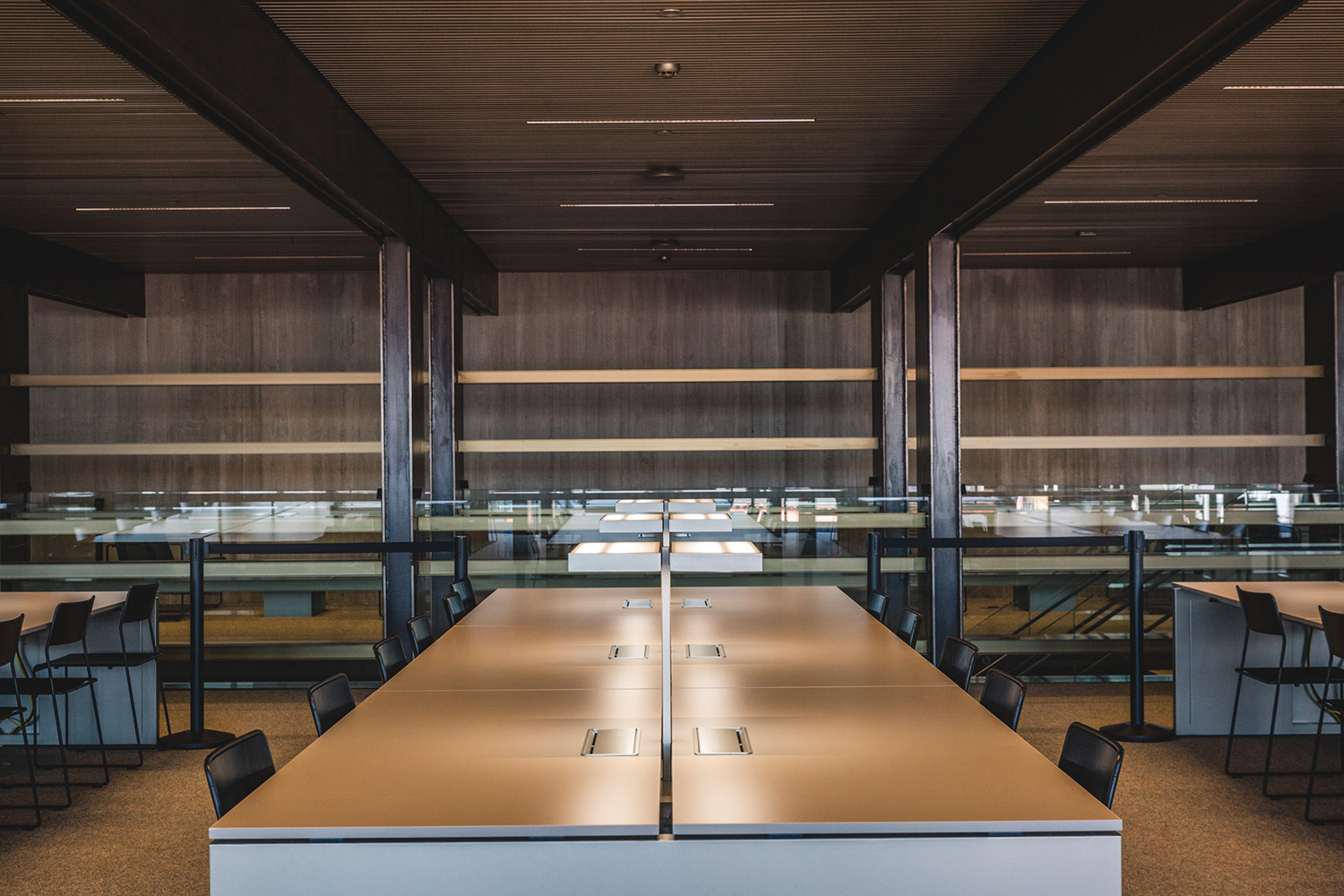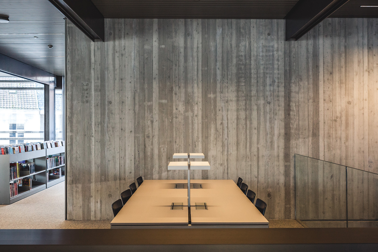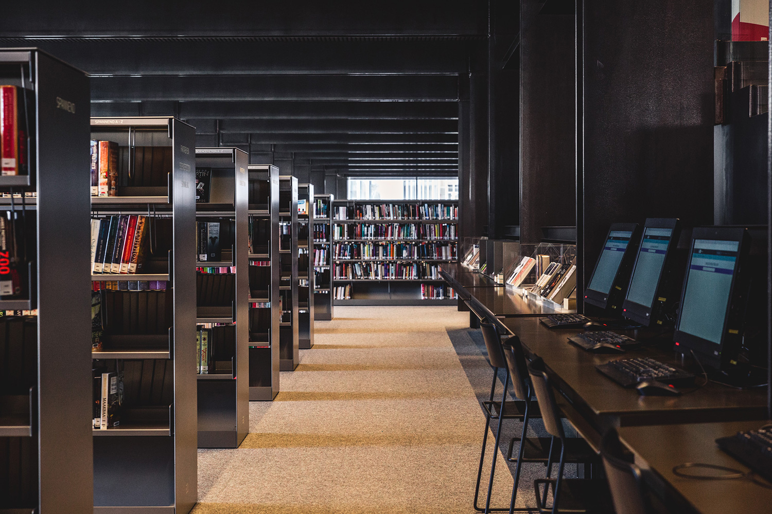 The powerful design of the building is continued inside, with library shelving and custom made furniture in solid steel in a sober color palette. The spacious library collection has been arranged in an open and linear layout with shelving deliberately kept low to maintain the feeling of an open space. The shelving is based on the 60/30 shelving system, but were adapted to the library's needs and the aesthetic expectations of the architect. Steel cover plates and skirtings form a solid casing with LED strips illuminating sloping shelves. Simple but clear signage indicates the reader's way around the library.