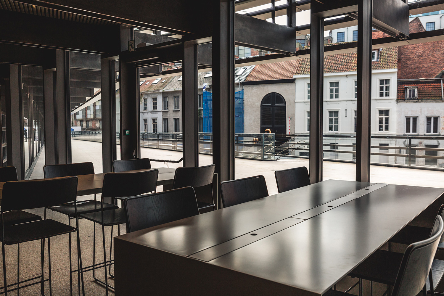 The Krook, a large-scale urban renewal project, is a building that looks like a steel barge and includes the new city library, laboratories and offices of Gent University. The Krook was designed by the Gent bureau Coussée & Goris in collaboration with RCR Arquitectes, 2017 winners of the Pritzker Prize.