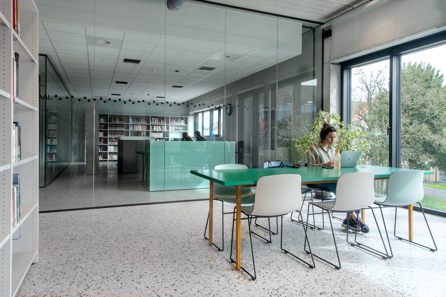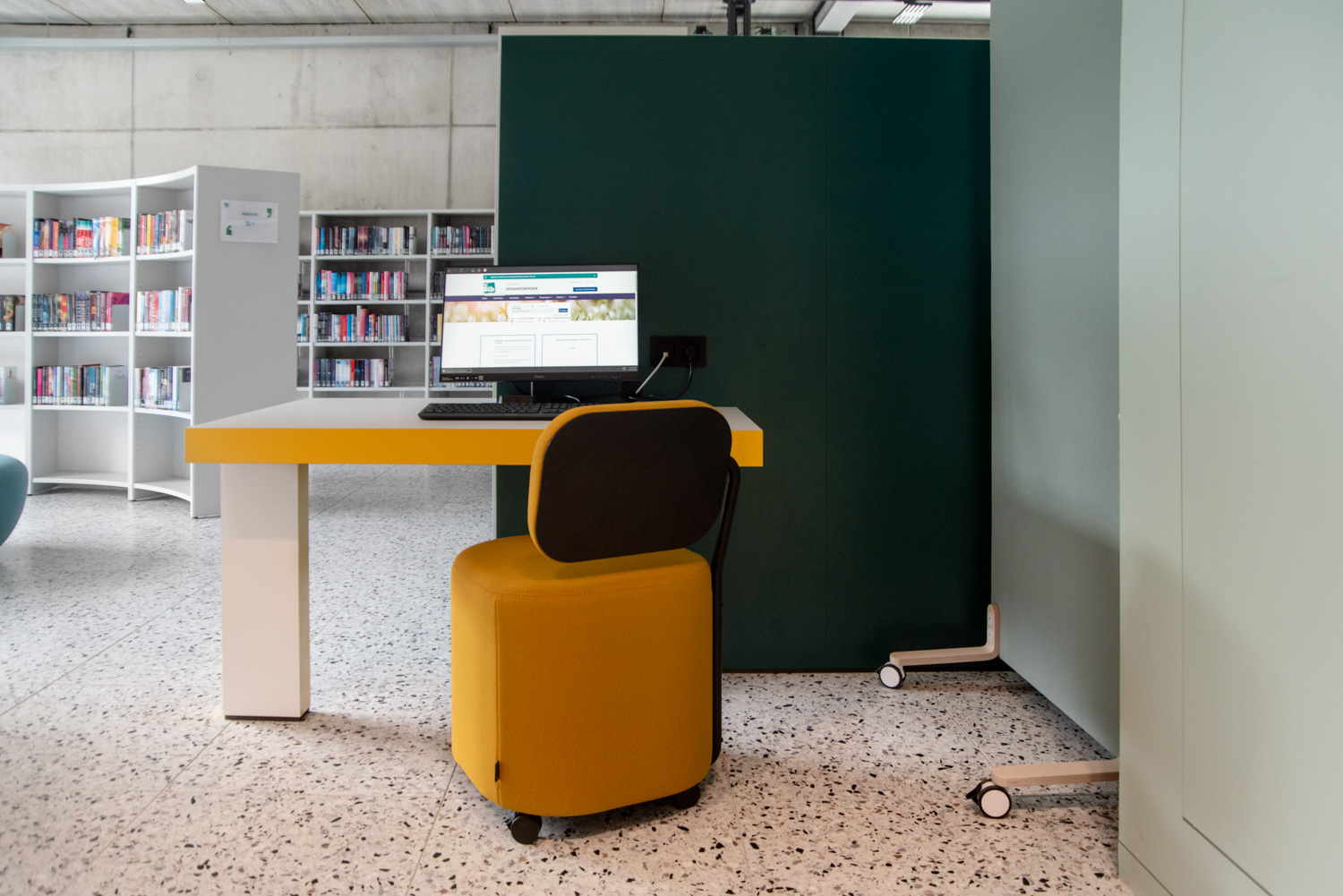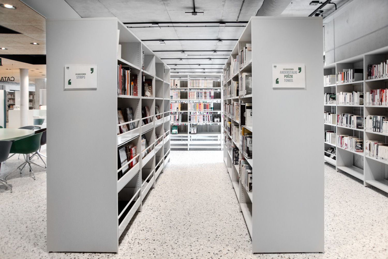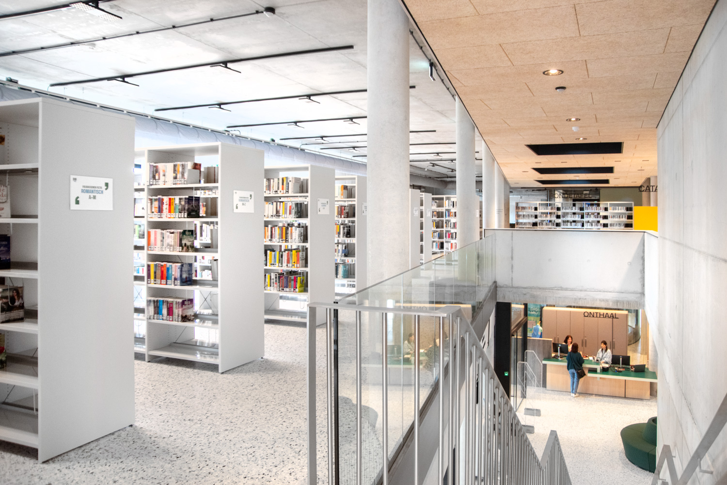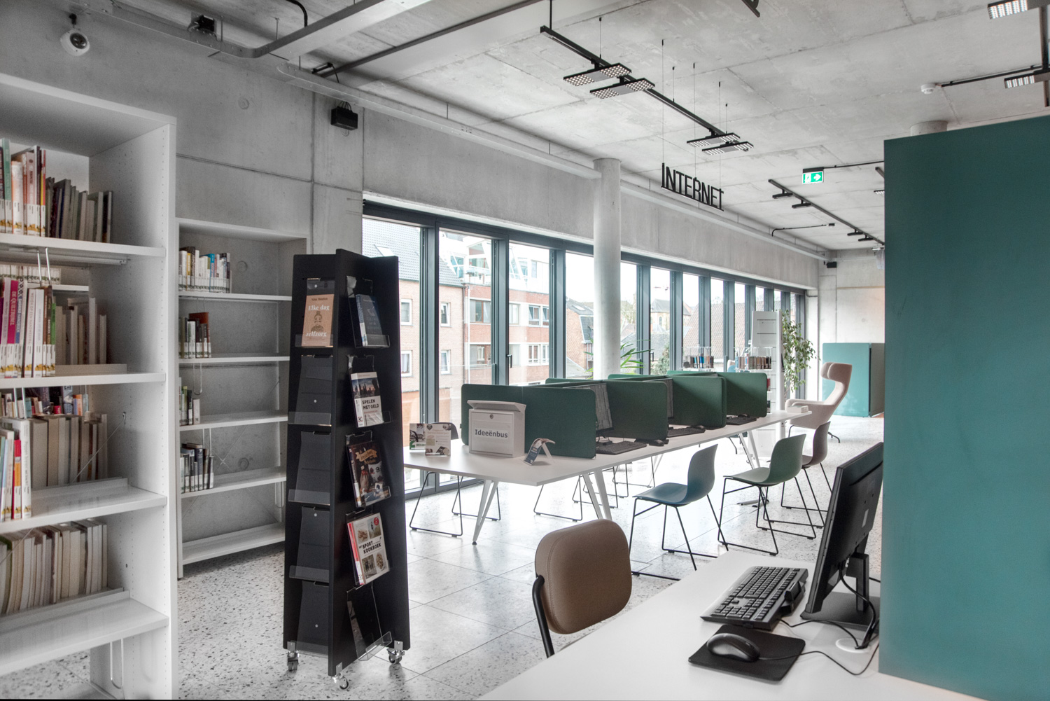 Light and space are central elements to the new library in Geraardsbergen. The library is more than just a place to borrow books; it is a space for reading, studying, playing games and much more. Visitors can choose from a variety of seating options: tables and chairs for working or studying, cosy and comfortable reading armchairs to relax in and poufs for quickly consulting a book.