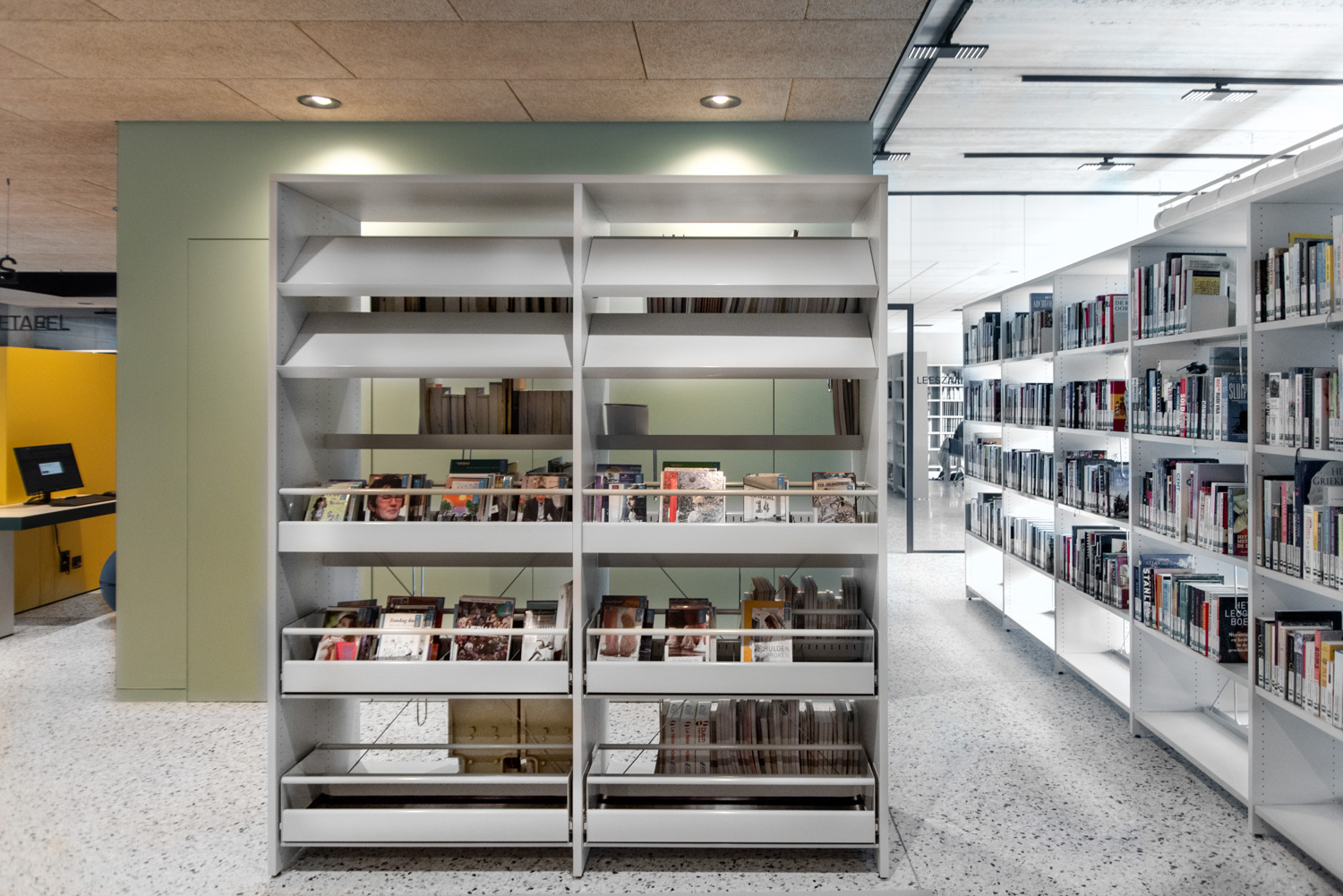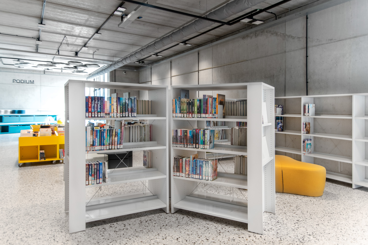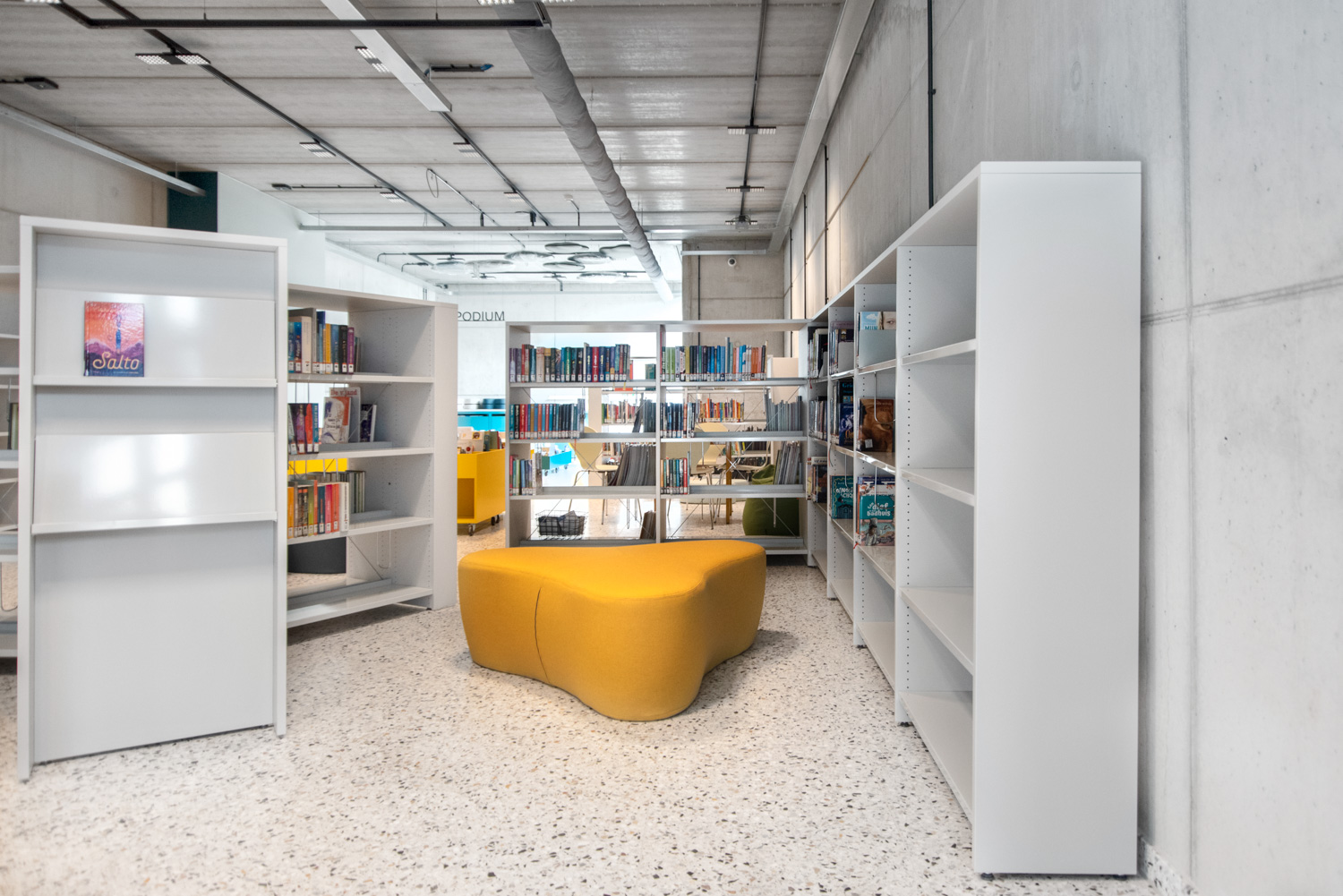 Throughout the library, the shelving is kept white to draw all attention to the contents – the books. The contemporary colour palette of the building is reflected in the furniture.