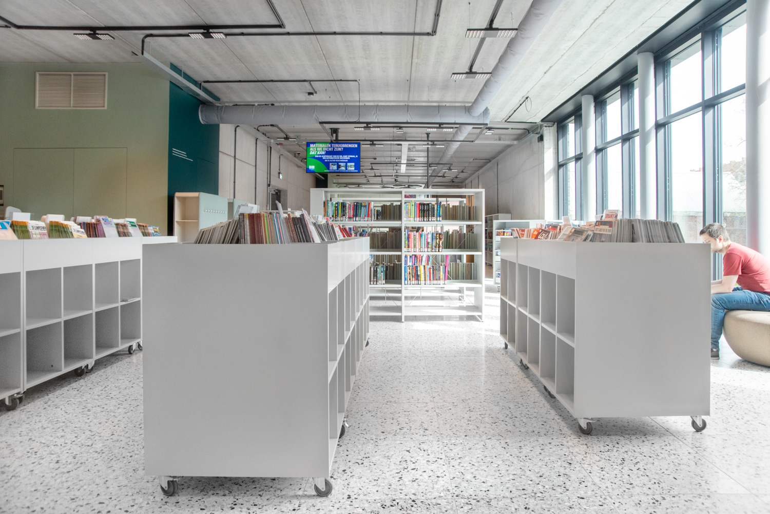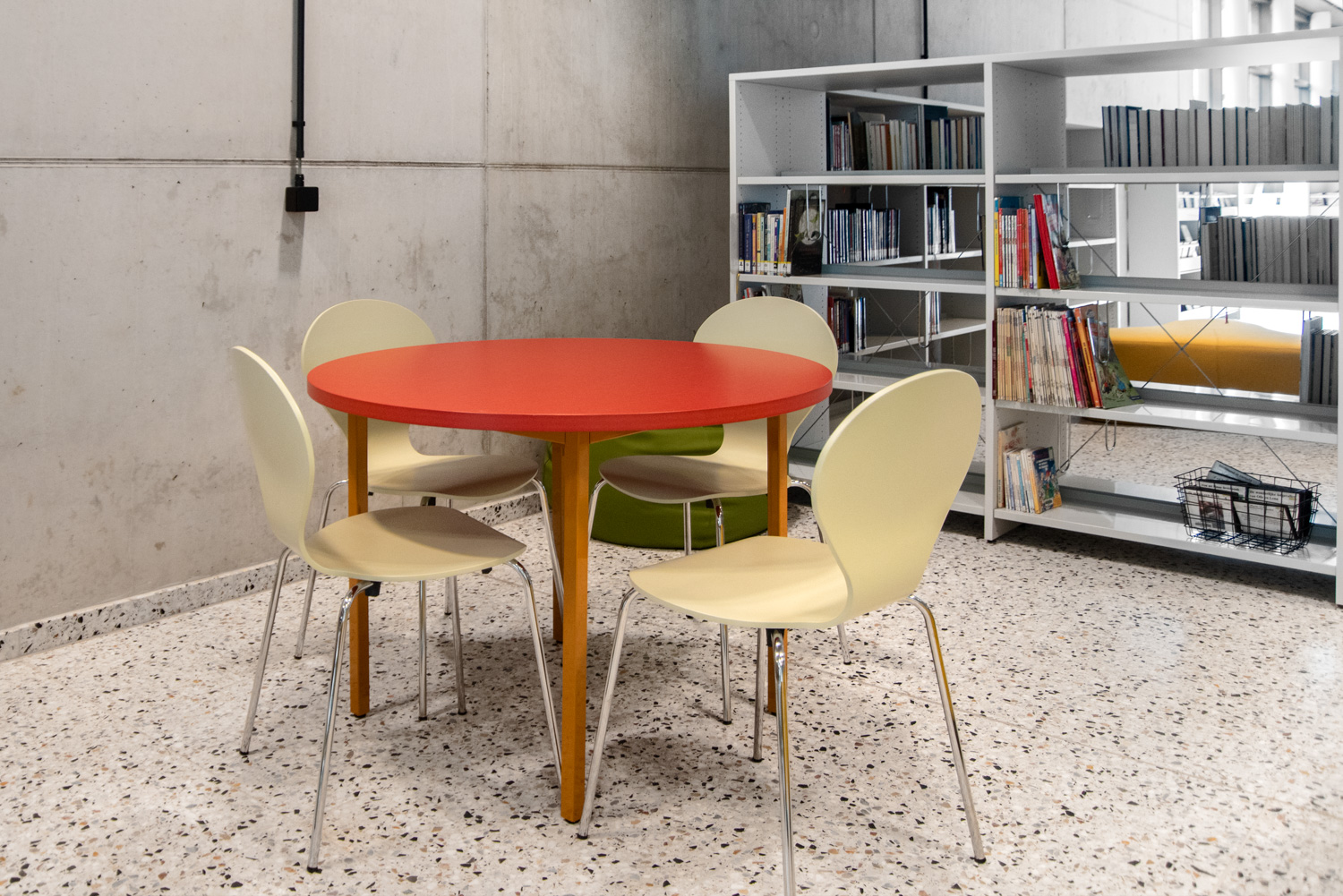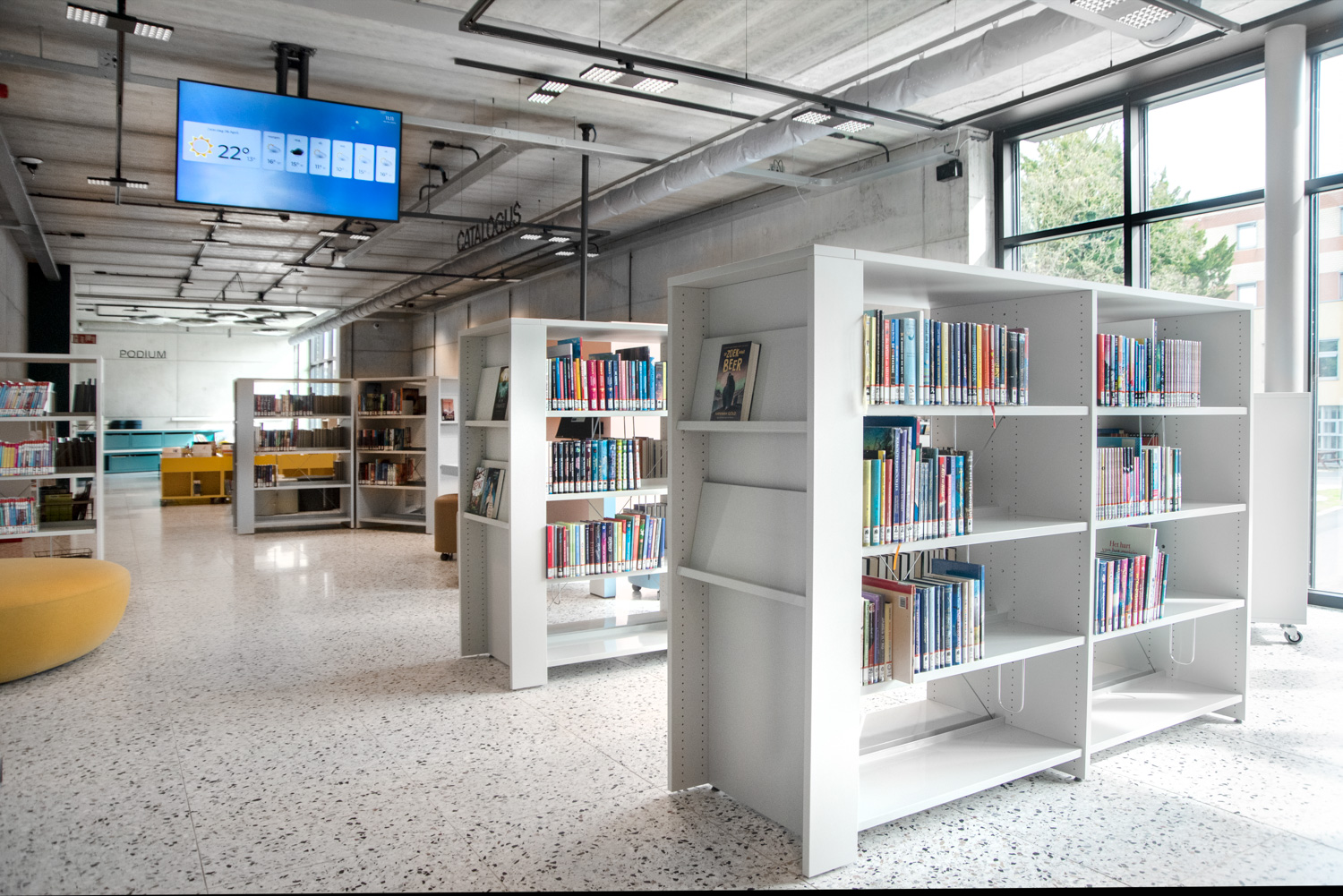 Throughout the library, the shelving is kept white to draw all attention to the contents – the books. The contemporary colour palette of the building is reflected in the furniture.