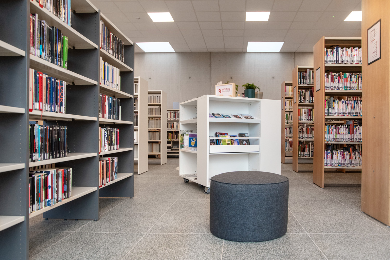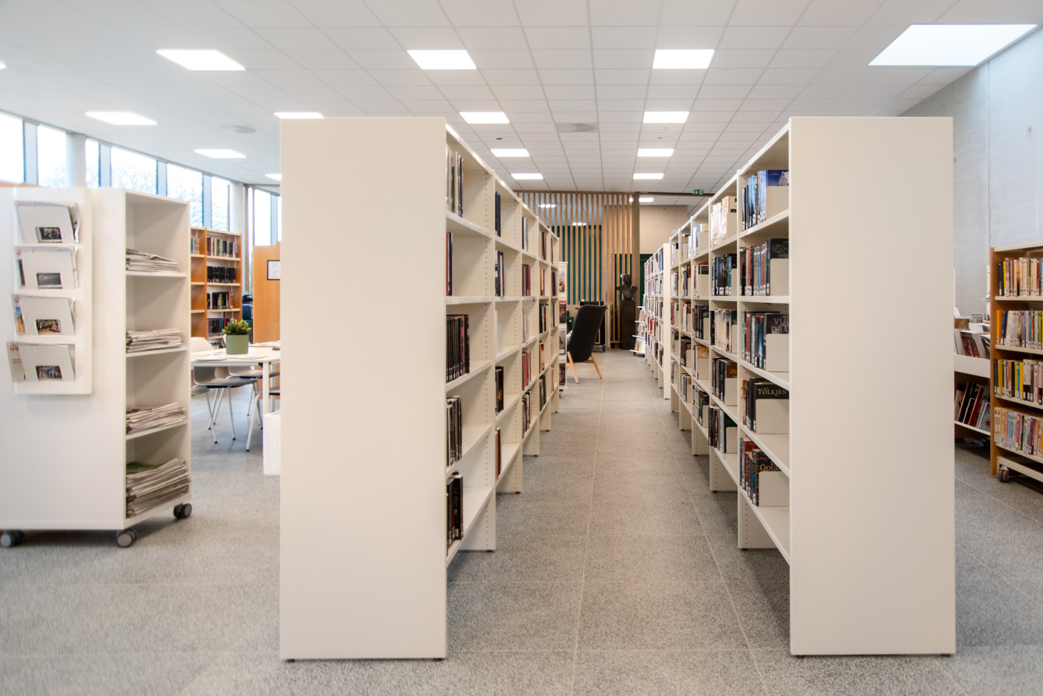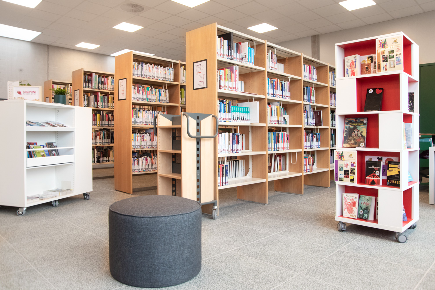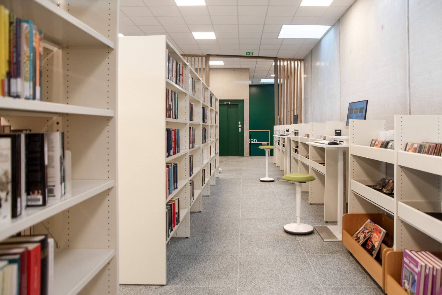 Accessibility has been a key priority in the new library design. The layout has been carefully rethought, allowing the various collections to stand out and support user discovery. The youth section now follows a clear progression from younger to older readers, enhancing both navigation and engagement. For adults, a quiet and inviting area has been created where visitors can explore the collection, study, relax or meet others.