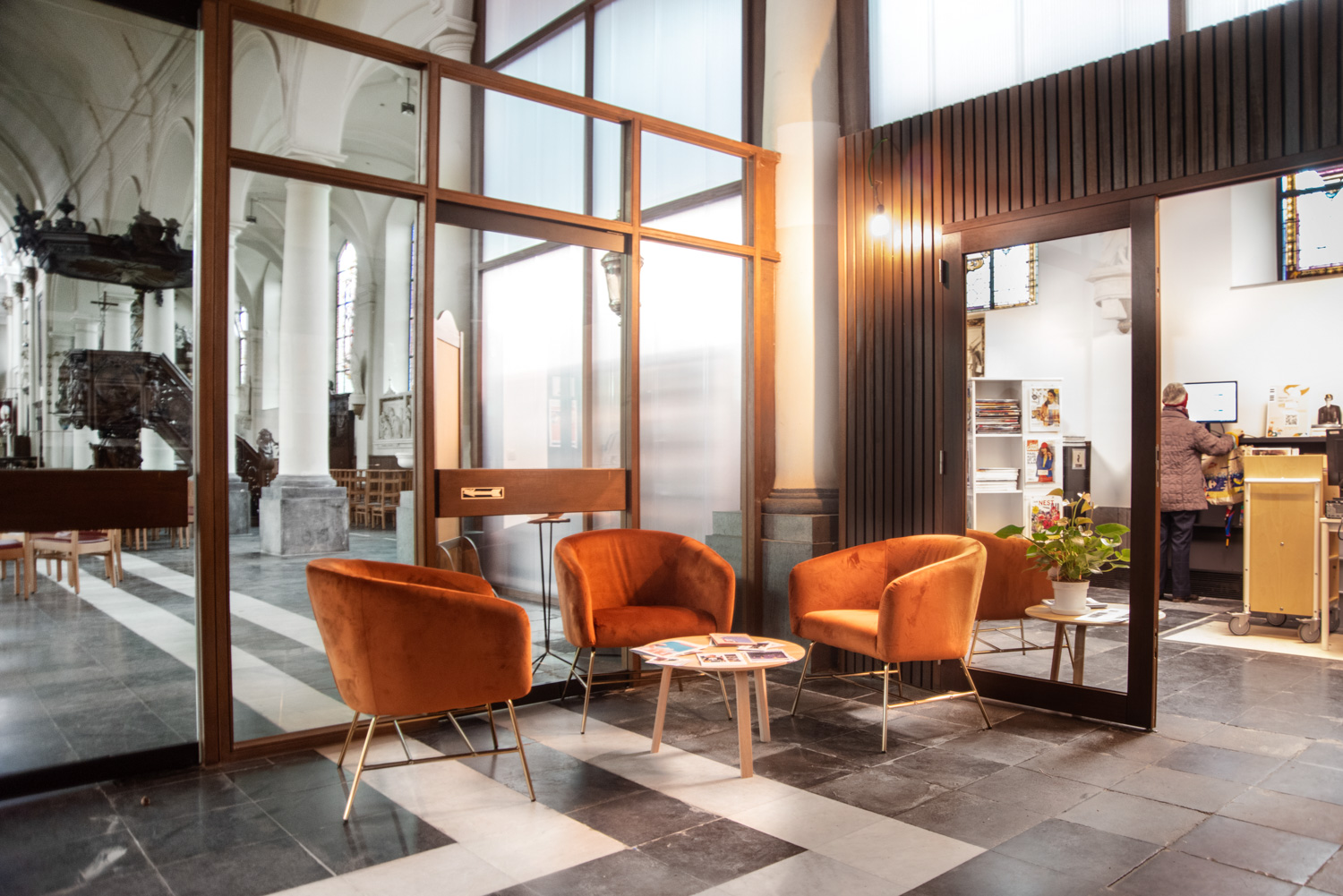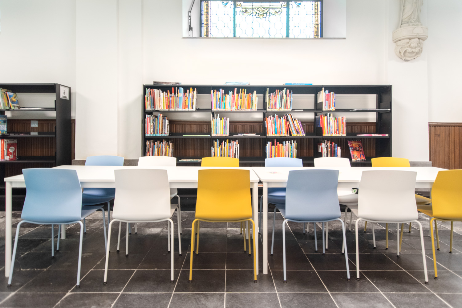 The rooms are tastefully furnished while respecting the building: the arches have been preserved, and the distinctive, abundant light from the large stained-glass windows typical of a church, is maintained through glass walls that separate the library from the church activities.