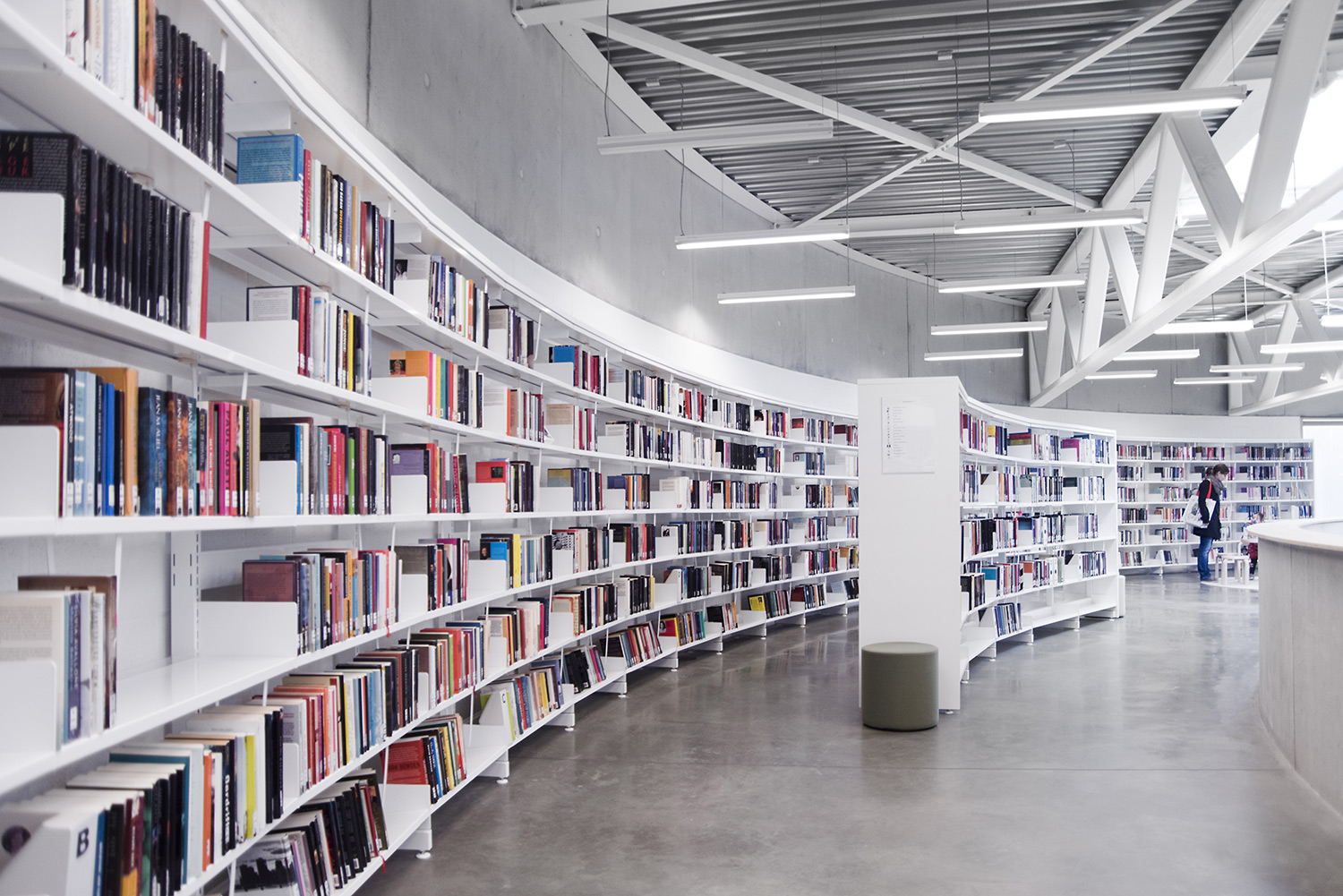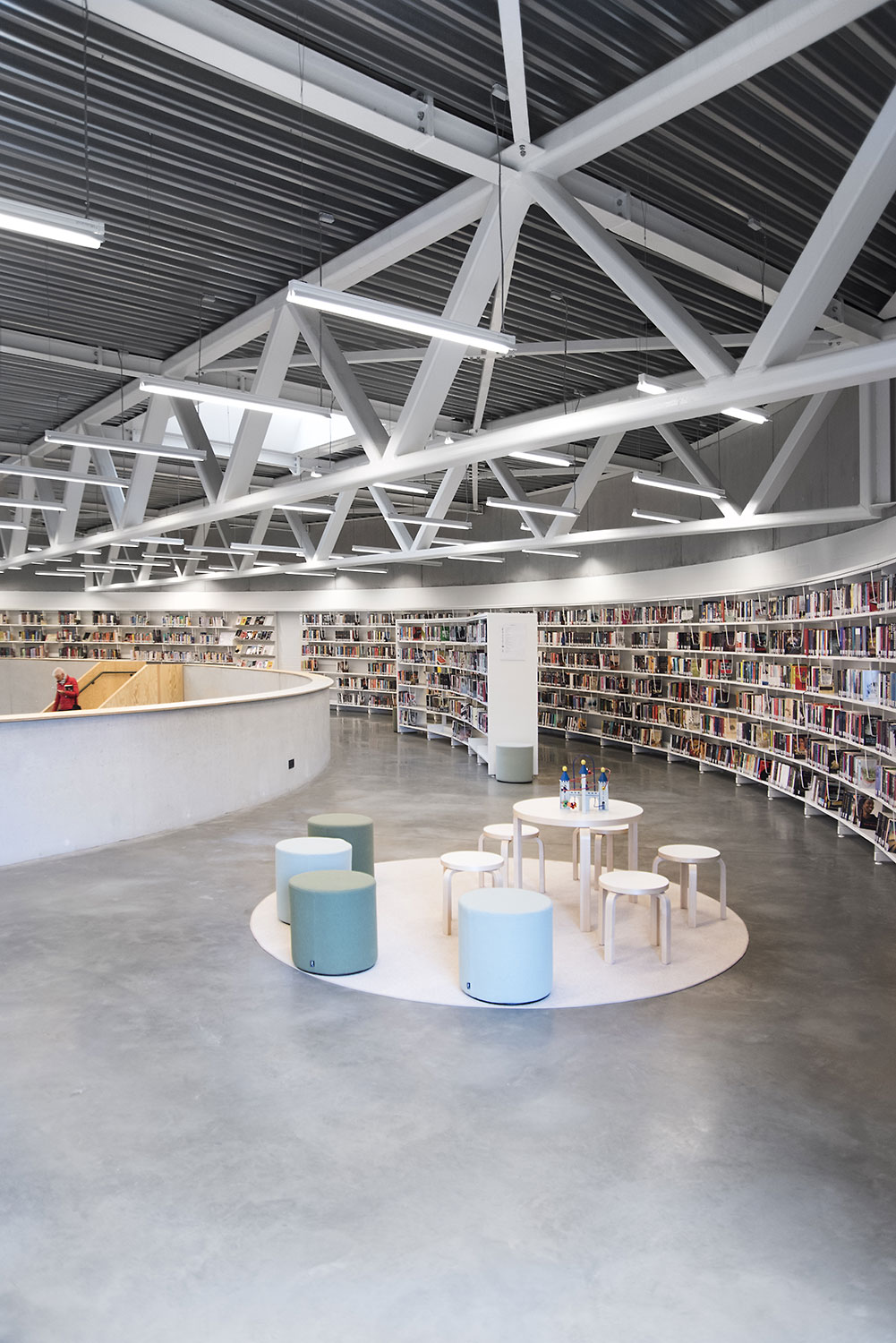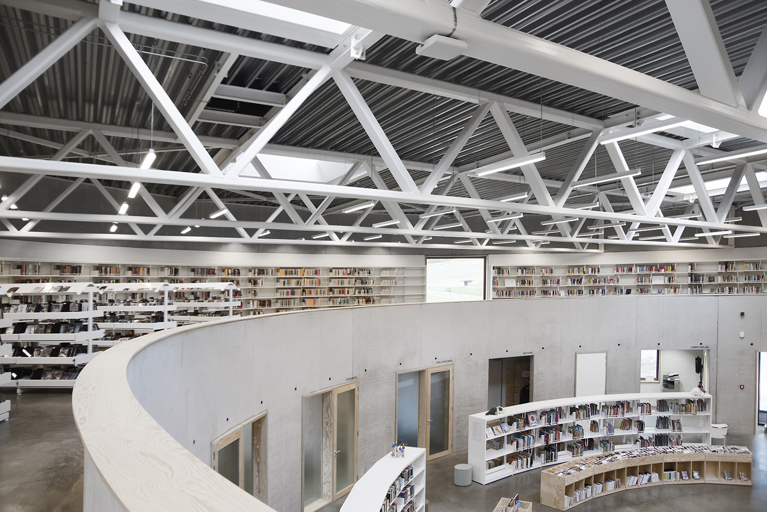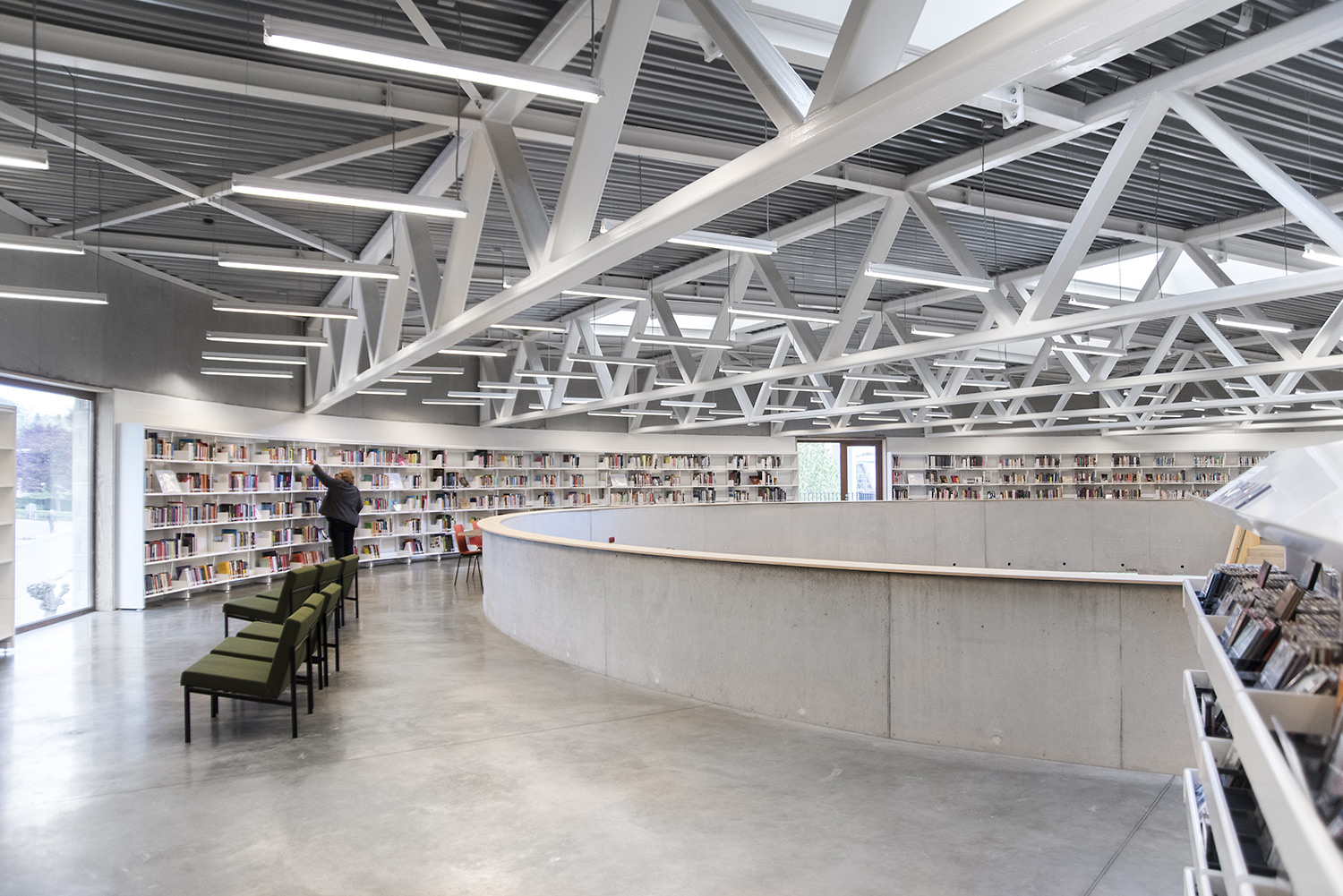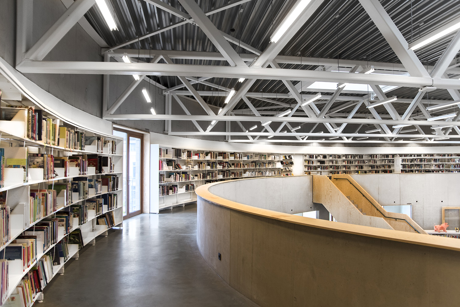 The 60/30 Shelving system follows the curved shape of the building so that the openness of the library is emphasized. The white shelving and the raw natural materials such as concrete and pine give the library a simplistic and sleek design.