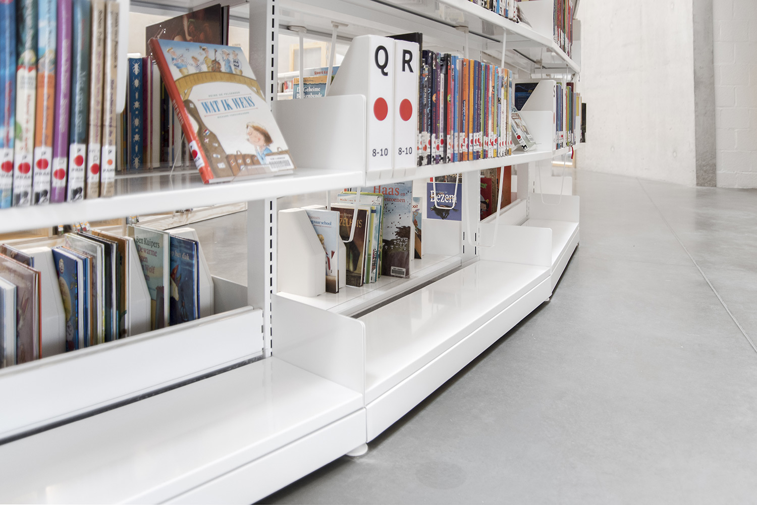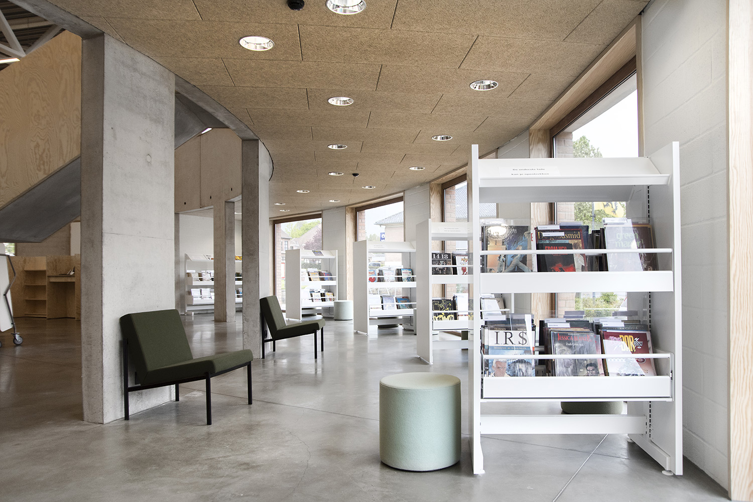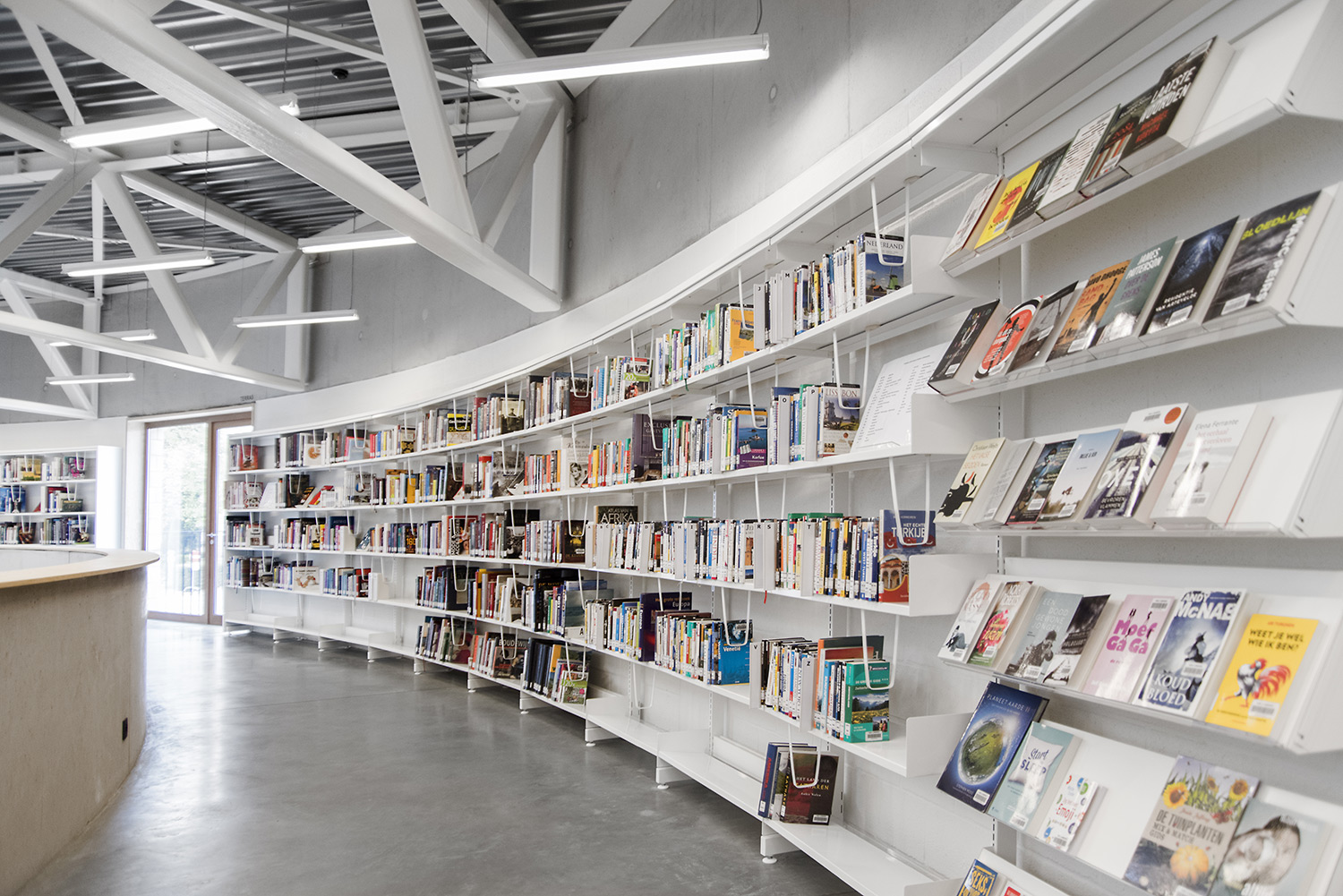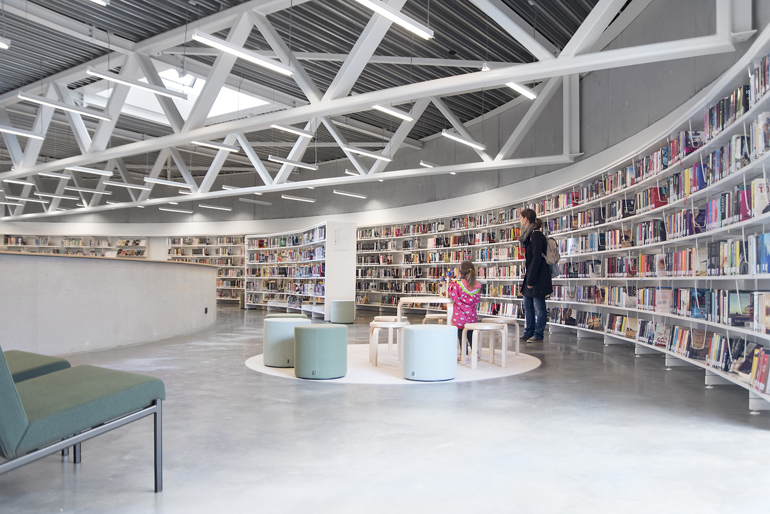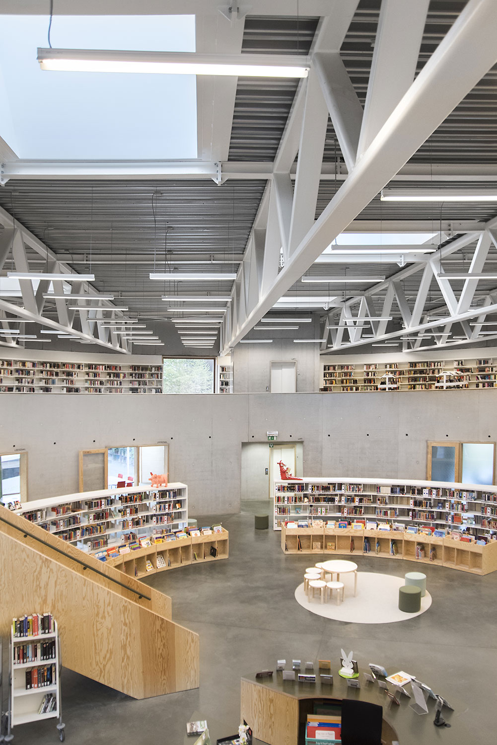 The 60/30 Shelving system follows the curved shape of the building so that the openness of the library is emphasized. The white shelving and the raw natural materials such as concrete and pine give the library a simplistic and sleek design.