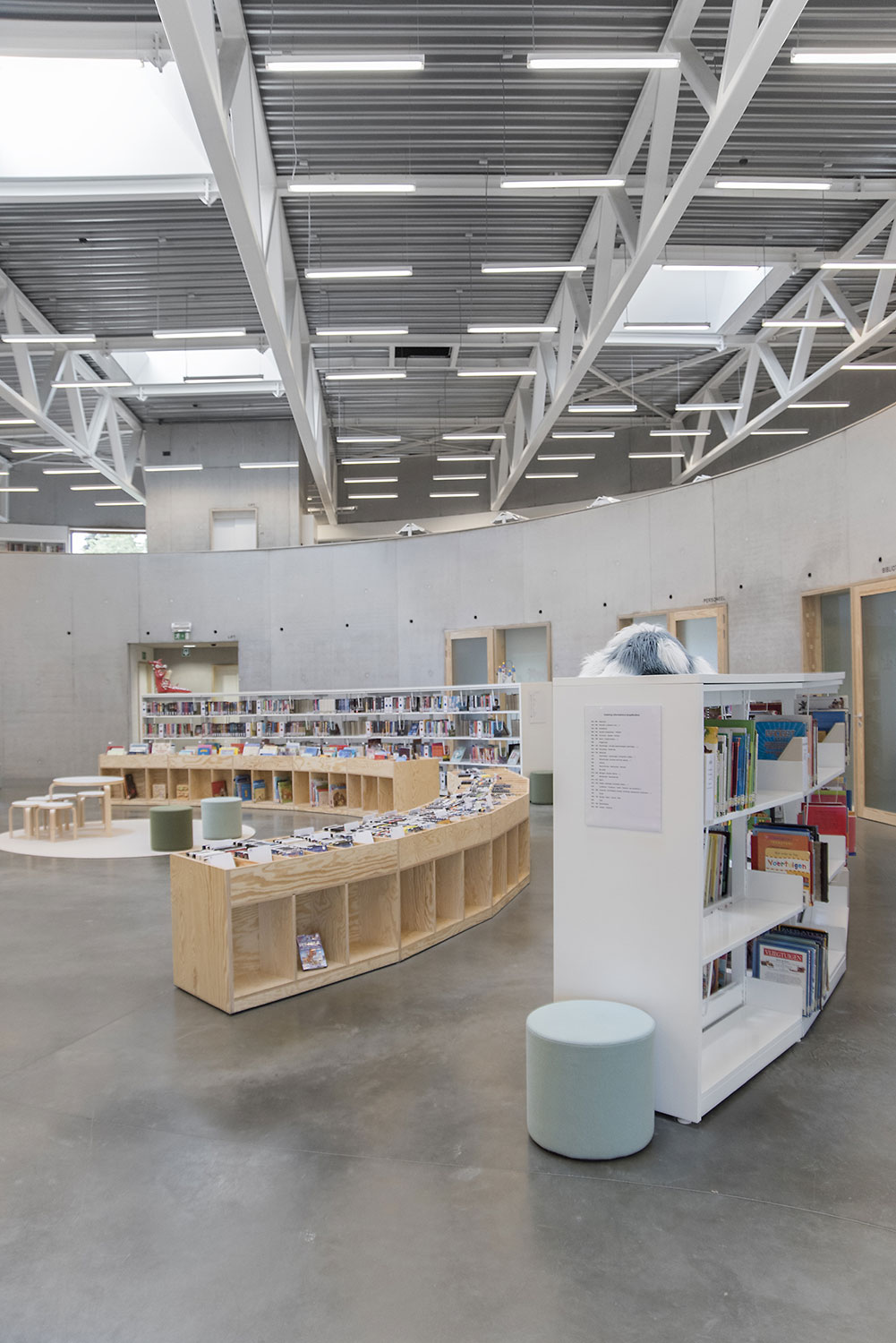 The old library, housed in a presbytery from the mid-eighteenth century, was due for renewal after 30 years. A new round building was chosen near the town hall. Thanks to its round shape, the building opens to the surrounding buildings and the street. The round construction meets the wishes of the library team: a clearly recognizable, transparent and inviting library, compact but very spatially and flexible to use.
