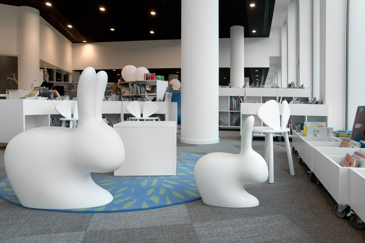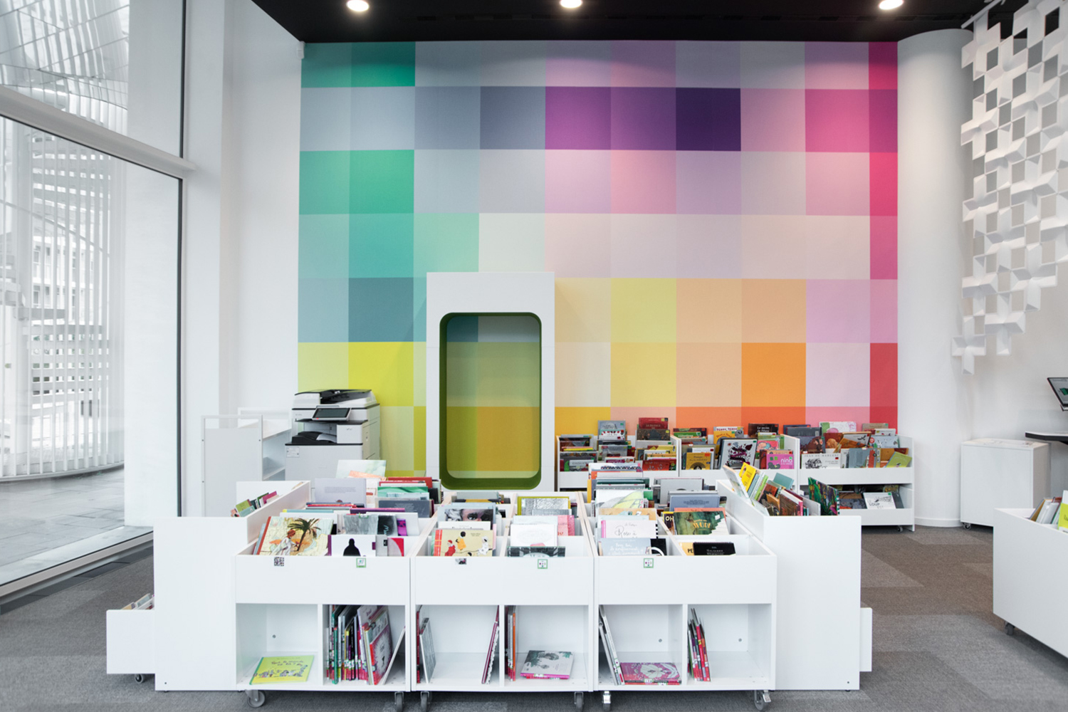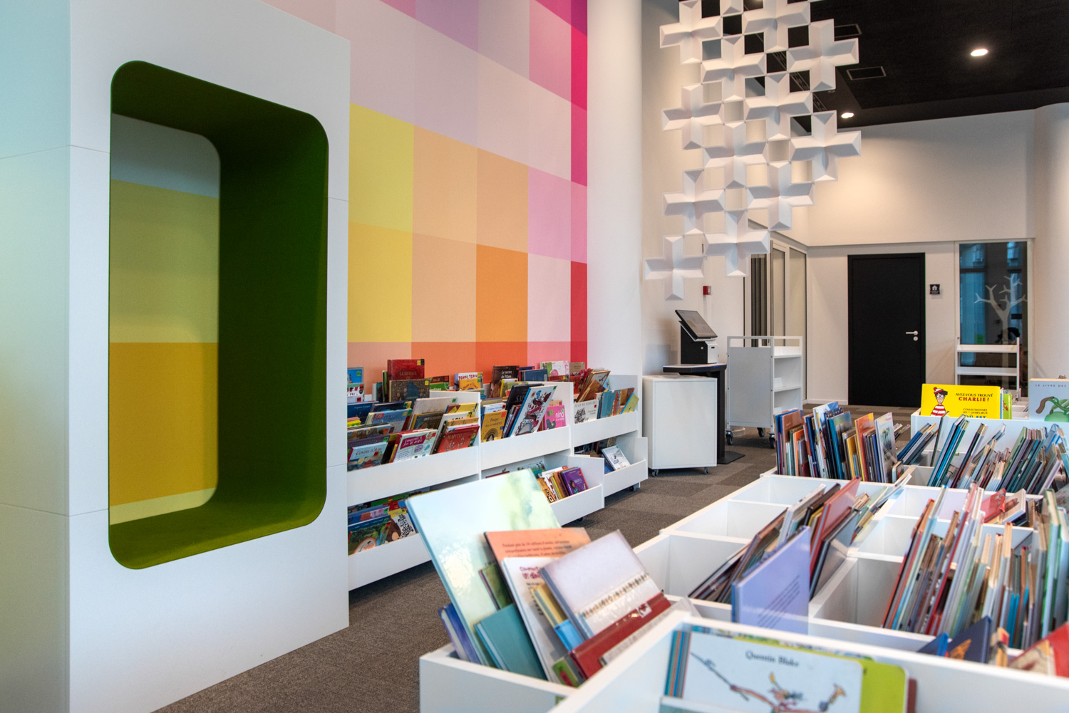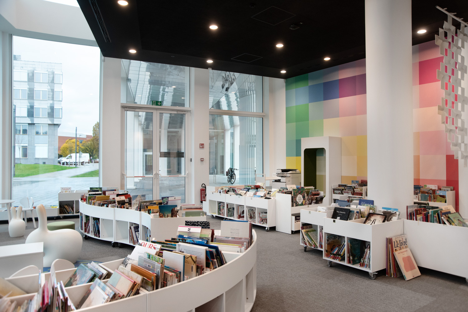 In addition to traditional collection zones, visitors now discover spaces dedicated to meditation, reading and working, a story hut, and a toy library for spontaneous play. Advanced technology facilities enable librarians to focus wholly on welcoming, advising and guiding both individuals and various groups.