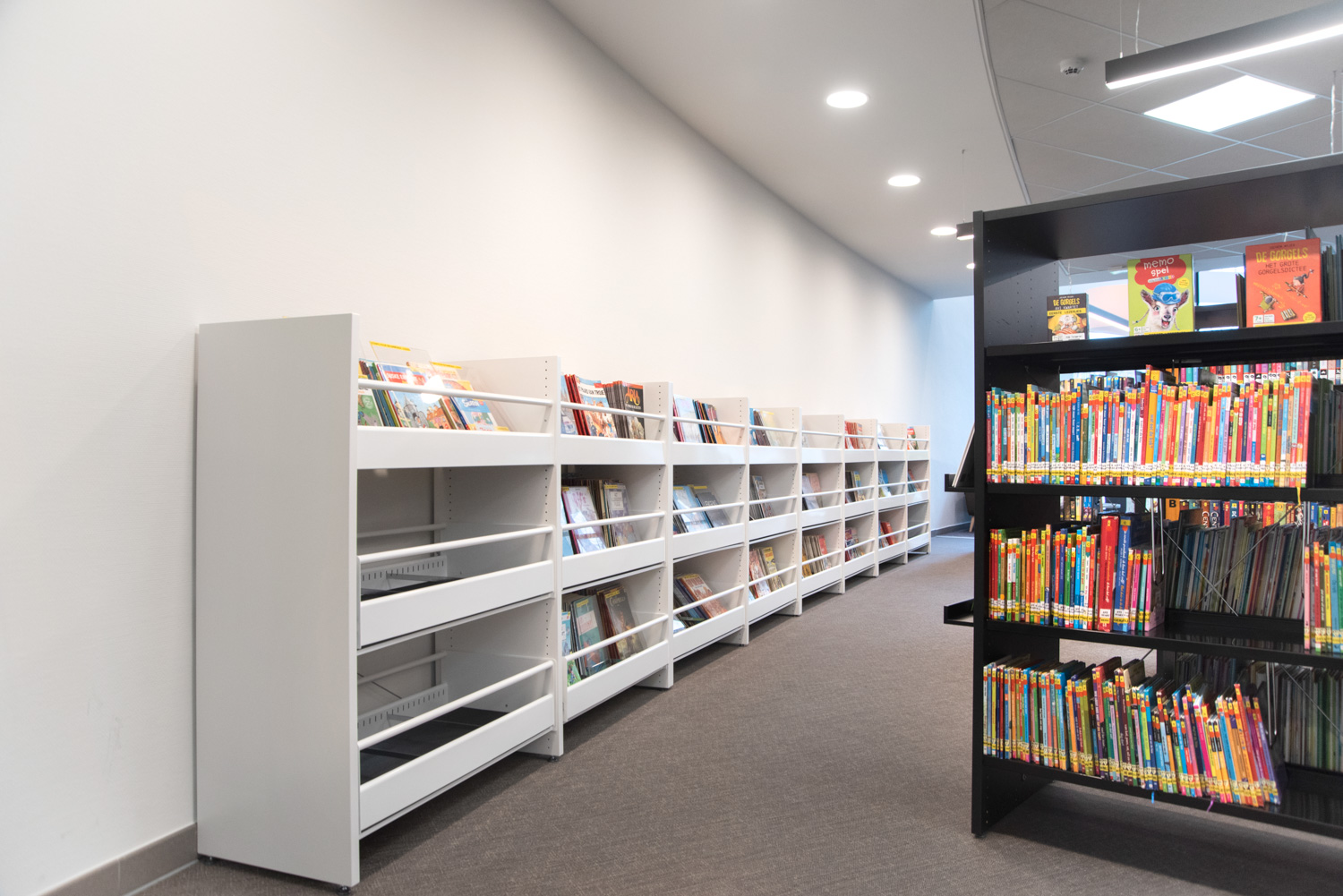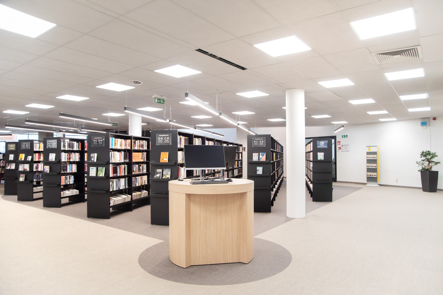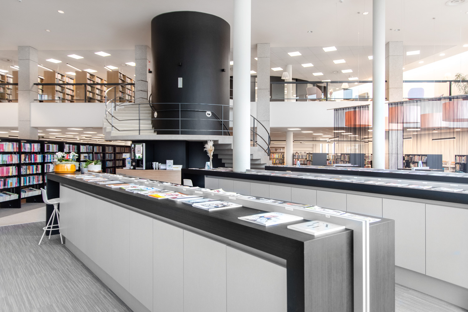 The library has been transformed into a cosy living room, where it is pleasant to stay and relax. Visitors do not just come to the library to borrow books; they also use the library to study, to read the newspaper or to have a chat and the new comfortable lounge areas are ideal for this. New arrivals are presented at the entrance, as well as on the end panels of the shelving systems.