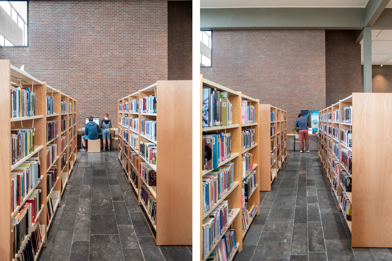Upon entering the library, the visitor first meets a cozy reading room. In the rest of the library, you will find a mix of library shelving systems and bespoke furniture in a sensible choice of materials, that go well with the original interior.