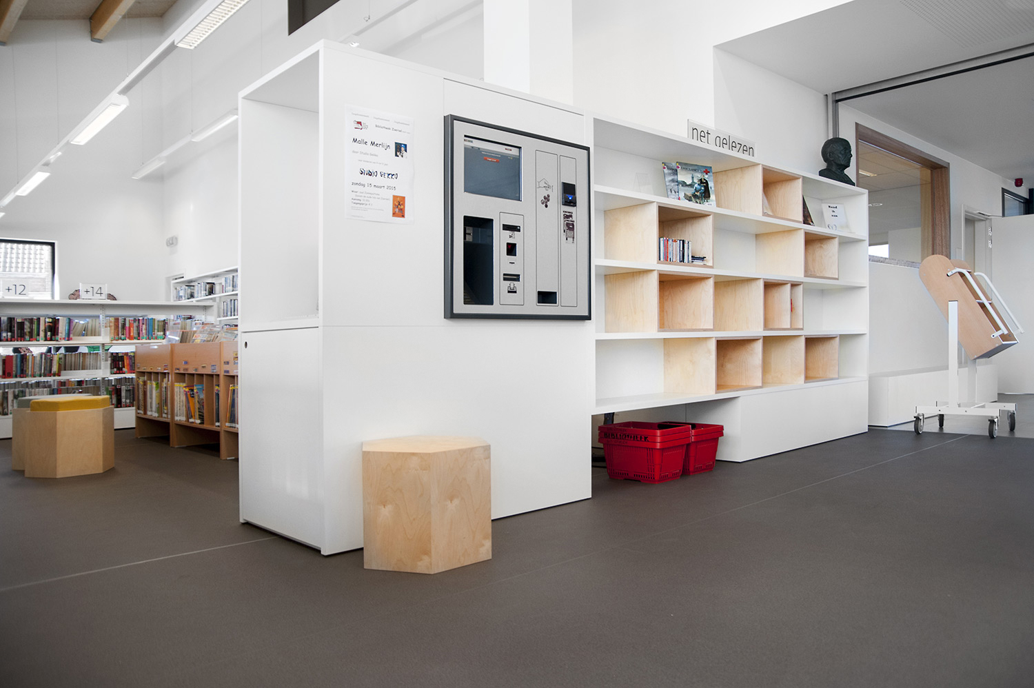 After years of not having a purpose-built location and being housed in a provisional building, the doors of the brand new Zoersel Public Library opened on 24 January 2015. The specified building's unique architecture and central location naturally turned it into the new town icon. It offers cozy reading spaces, study and laptop tables and custom-designed furniture. The combination of clean, white shelving alongside eye-catching, birch wood, hexagonal shapes that are punctuated with oranges and yellows, creates a modern yet calming atmosphere that draws people in from off the street. With a separate computer room and various meeting rooms, this library is fully attuned to the needs of its community and definitely deserves its new place in the heart of the town.