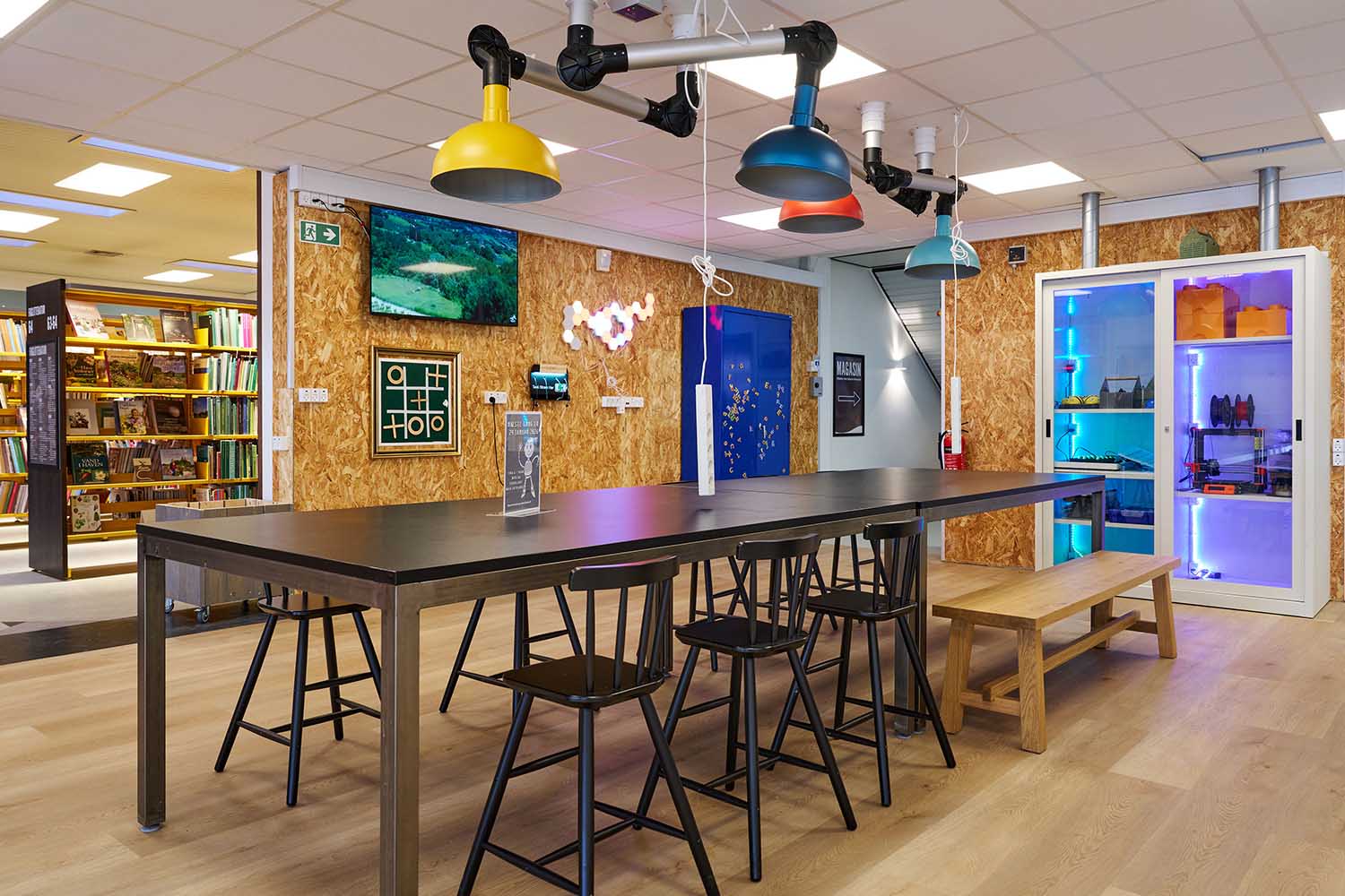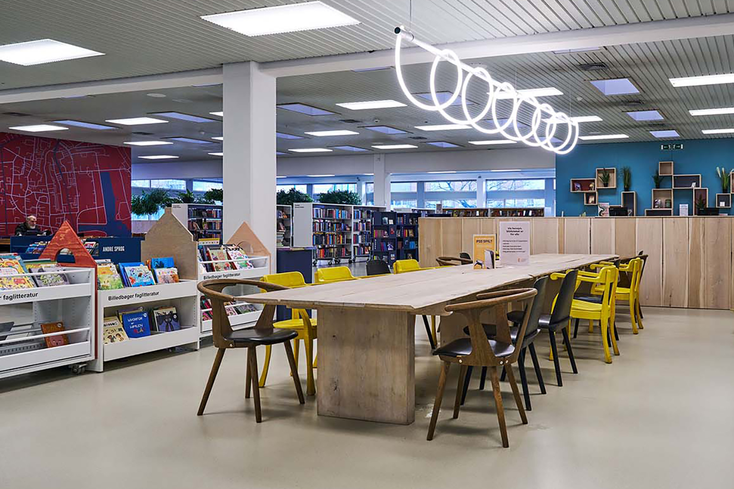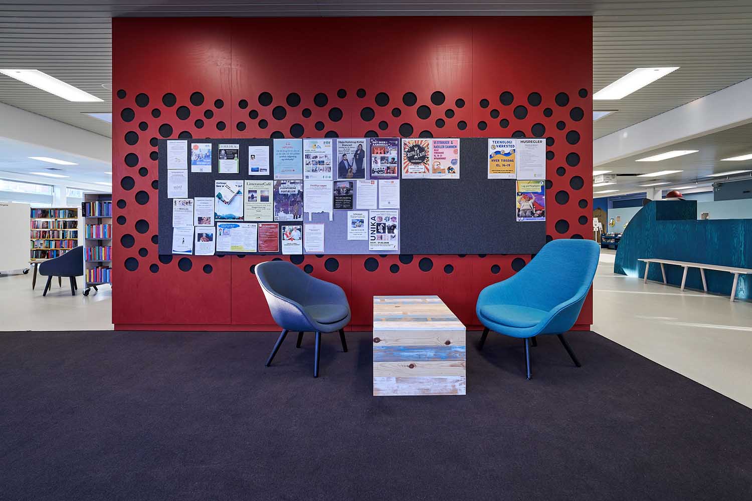 The reuse of existing furniture and materials has been a guiding principle throughout the project, combined with professional advice on colour schemes and flexible solutions. The result is a relaxed and functional library that supports both focused study and social interaction.